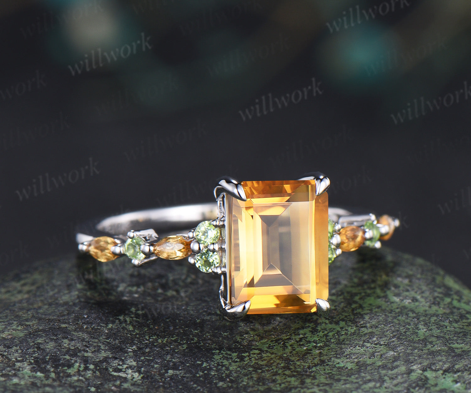 Emerald cut citrine engagement ring peridot marquise yellow citrine wedding ring November birsthone jewelry