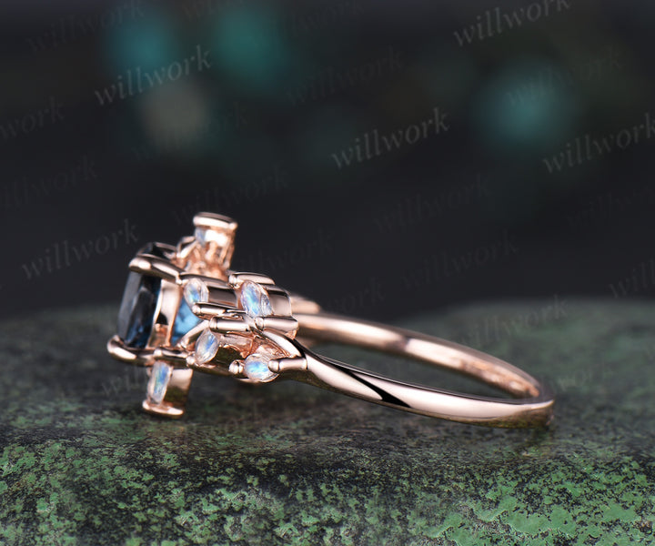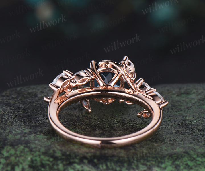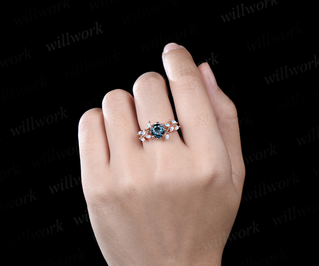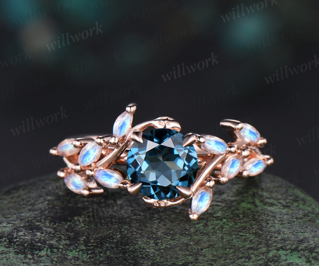 1ct round London Blue Topaz Moonstone Ring Vintage rose gold Leaf Cluster Engagement Ring December Birthstone Gift Women