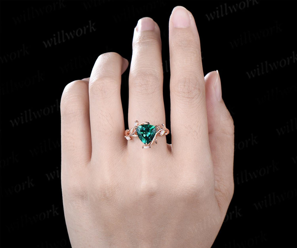 3ct Trillion cut green emerald engagement ring solid 14k rose gold leaf nature inspired five stone opal ring vintage May birthstone ring