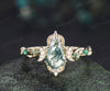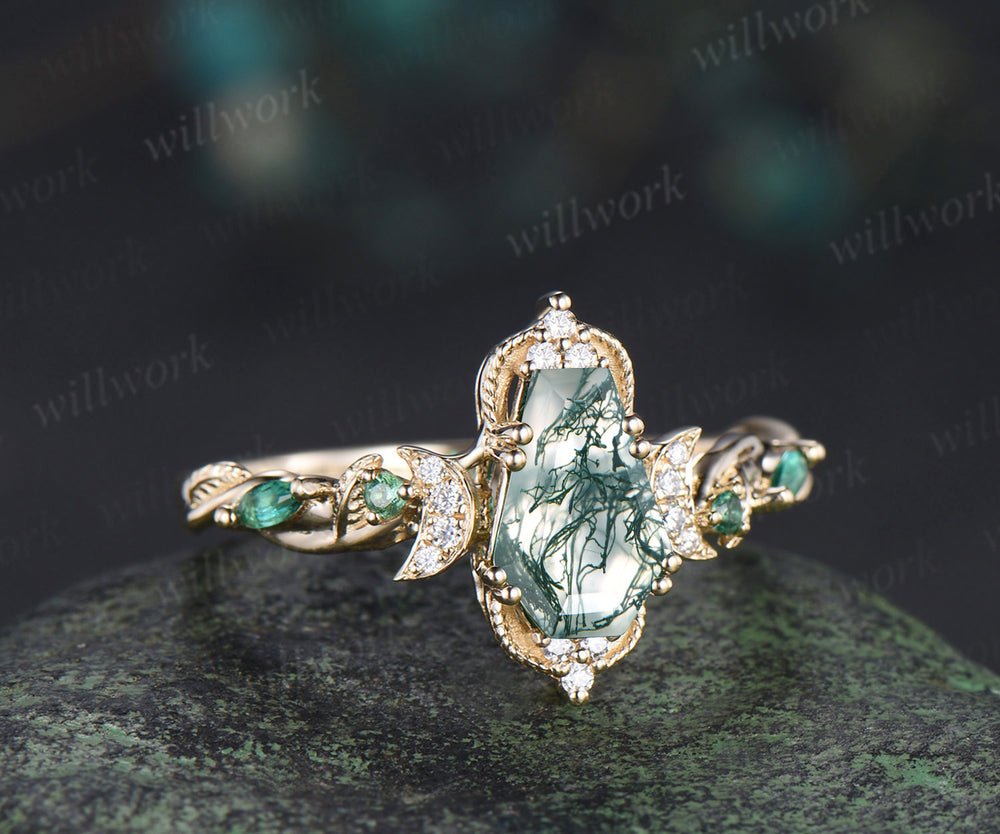 Coffin cut moss agate engagement ring 18k yellow gold Milgrain leaf twisted moon diamond emerald wedding ring women