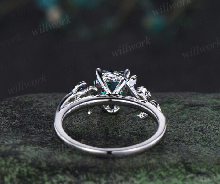 Heart cut green emerald leaf floral engagement ring women 14k white gold nature inspired promise wedding ring women gift