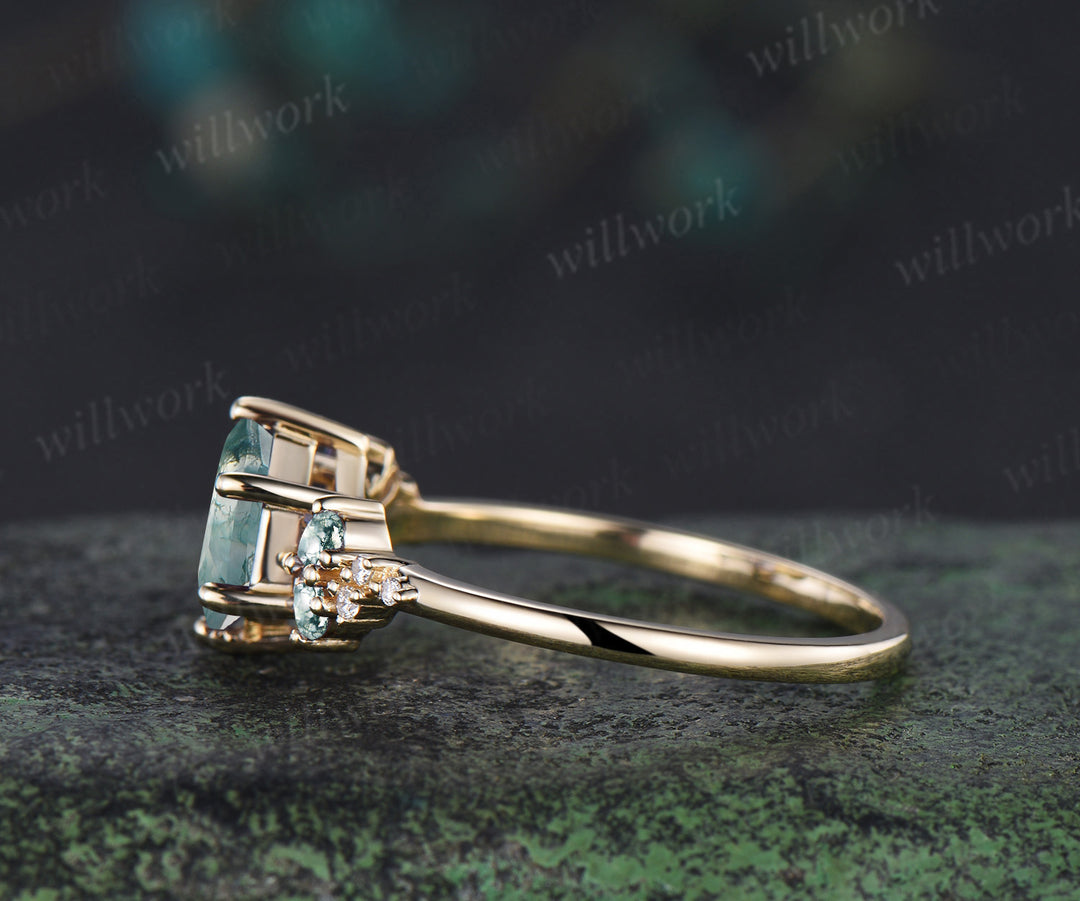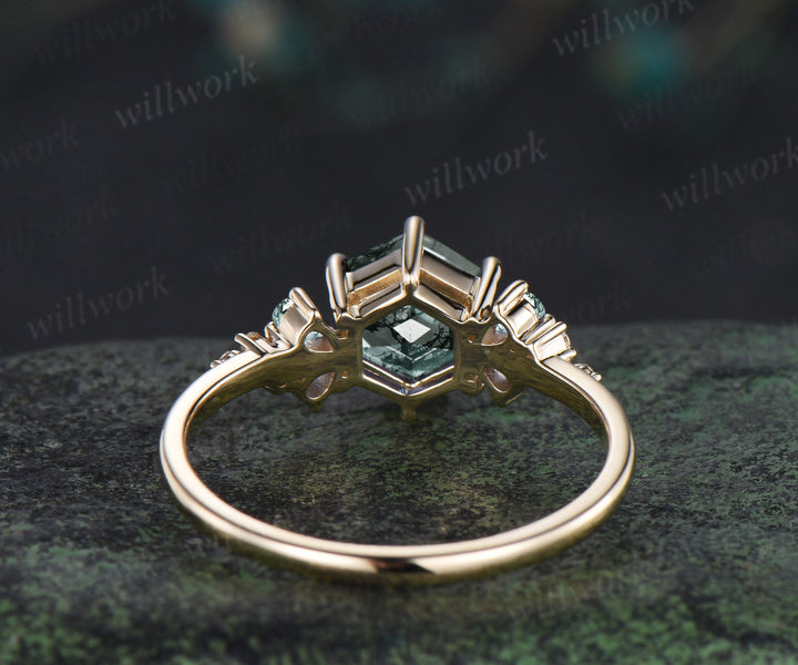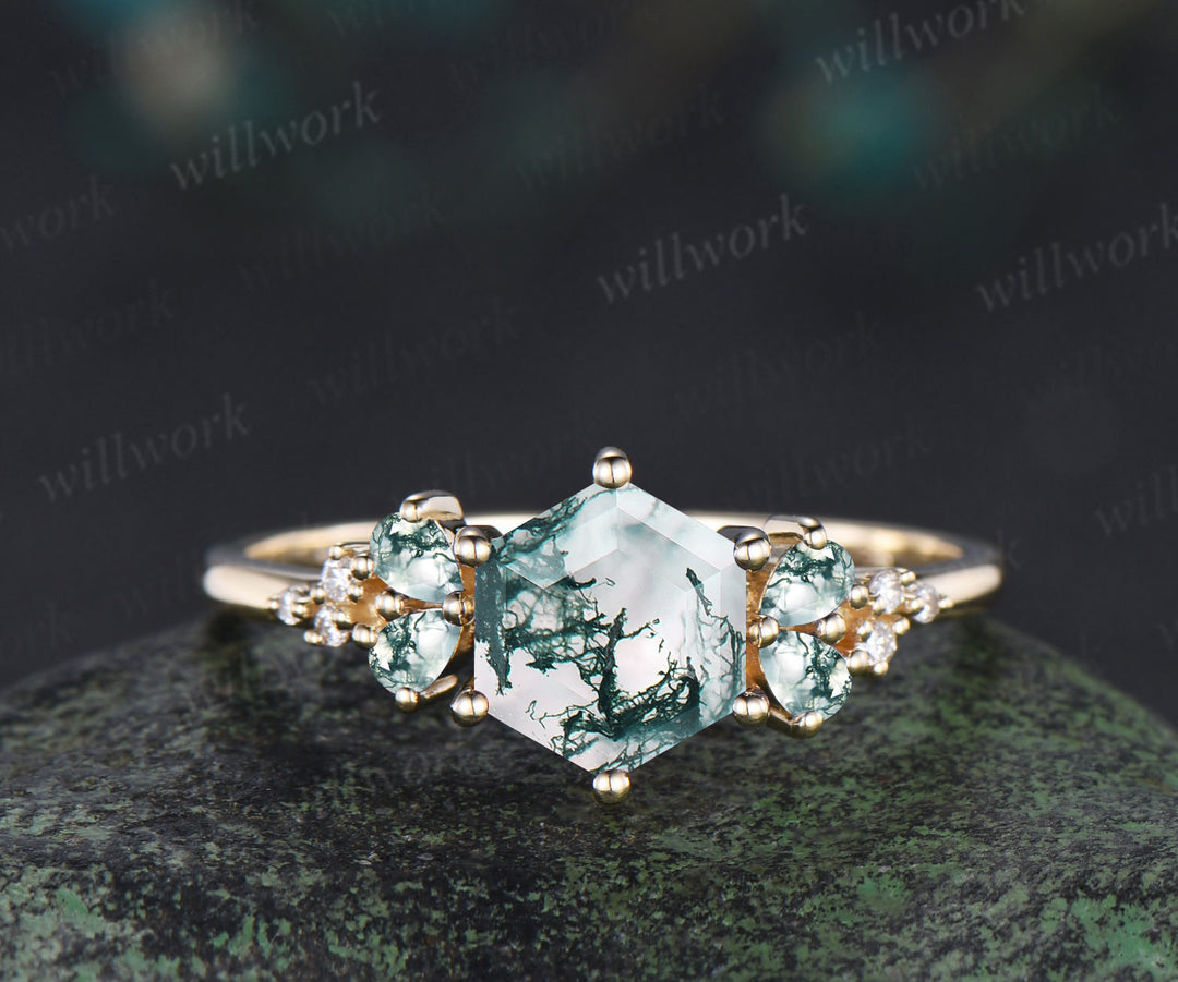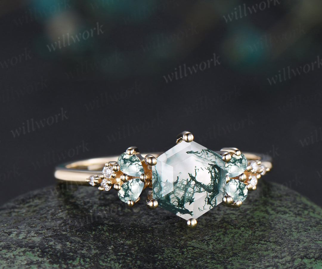 ***Unique hexagon cut moss agate engagement ring with pear moss agate and moissanite cluster accents. Crafted in solid yellow gold, this nature-inspired promise ring is a dreamy gift for her?aperfect for women who love earthy elegance and meaningful, one-of-a-kind jewelry.***- Metal: Solid gold(10K/14K/18K white/yellow/rose gold),925 sterling silver,platinum available