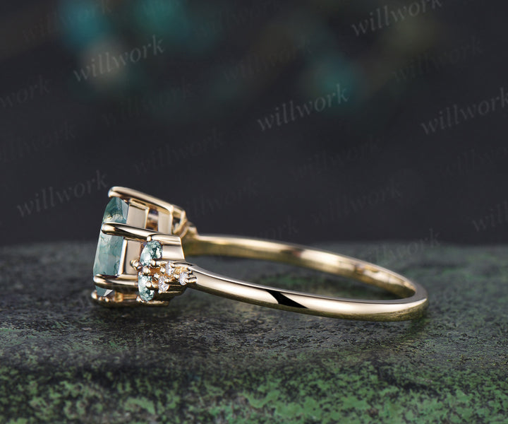 Hexagon cut moss agate engagement ring unique pear moss agate moissanite cluster ring solid yellow gold promise ring jewelry gifts