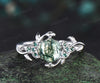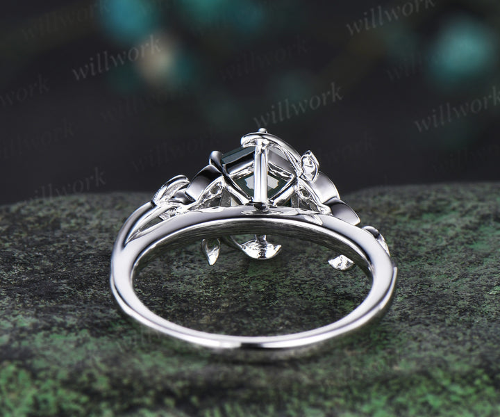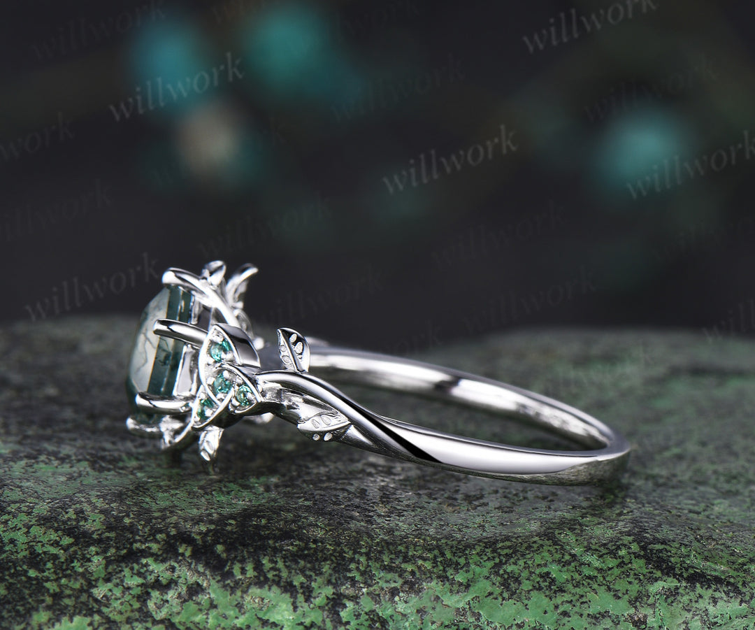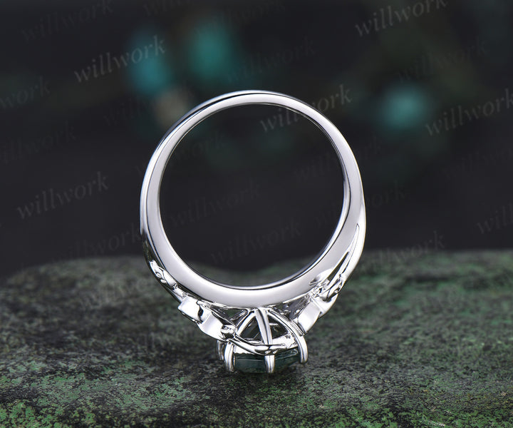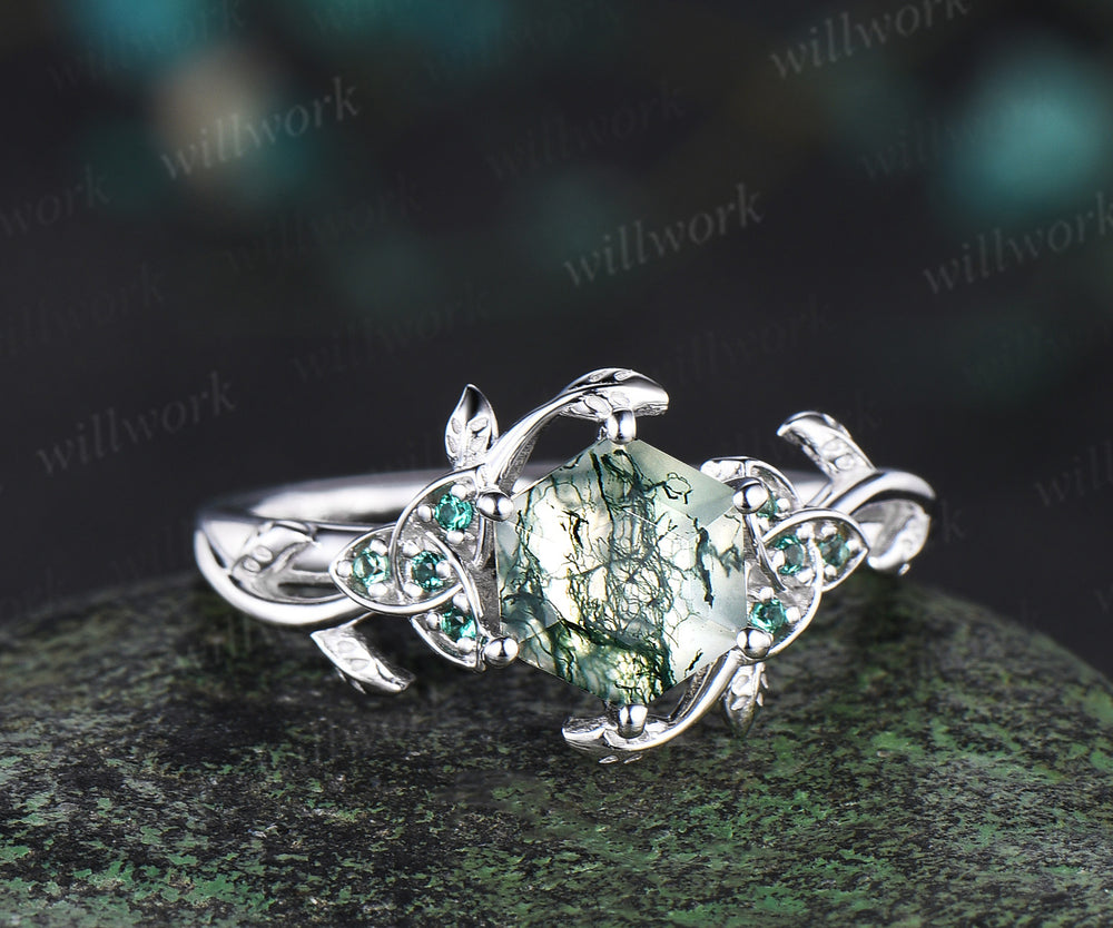 Hexagon cut Natural moss agate Celtic knot engagement ring white gold emerald leaf ring women anniversary gifts