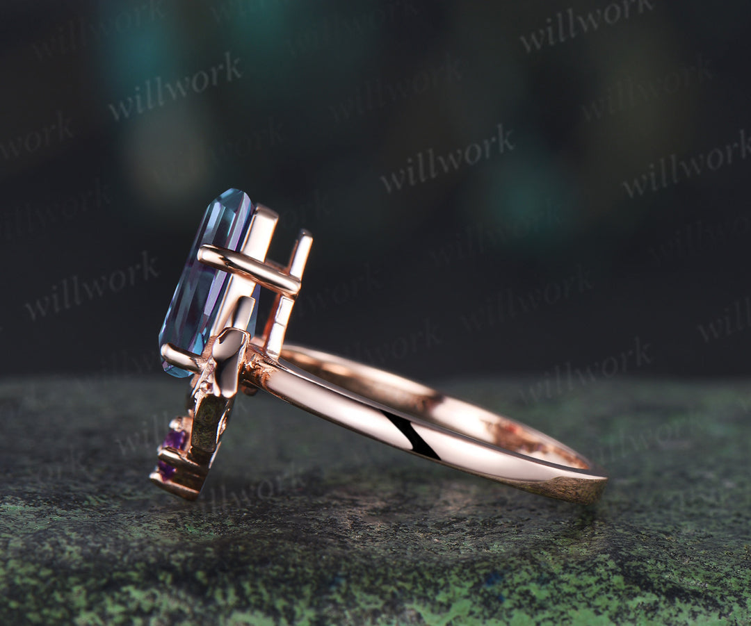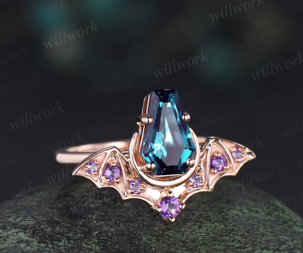 Kite coffin alexandrite ring vintage wing bat moon unique engagement ring 14k rose gold amethyst wedding ring women