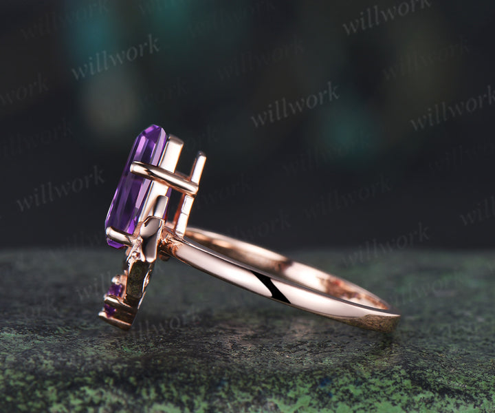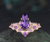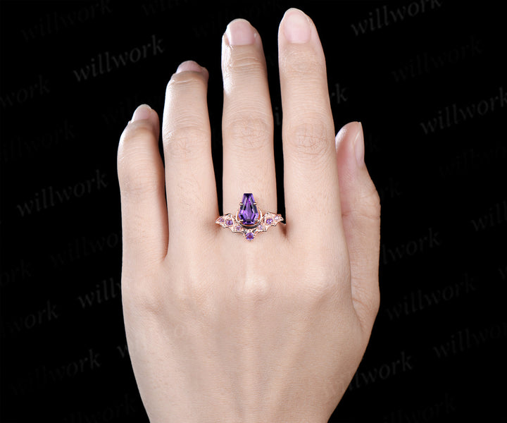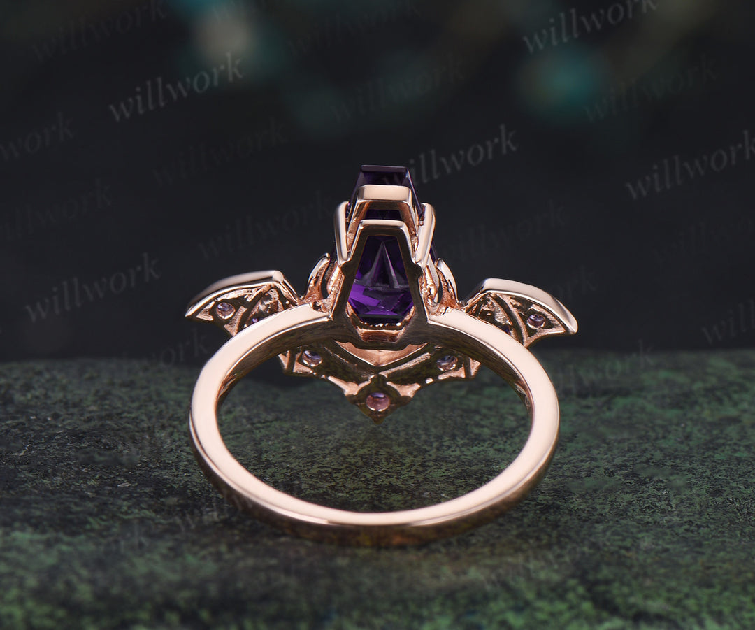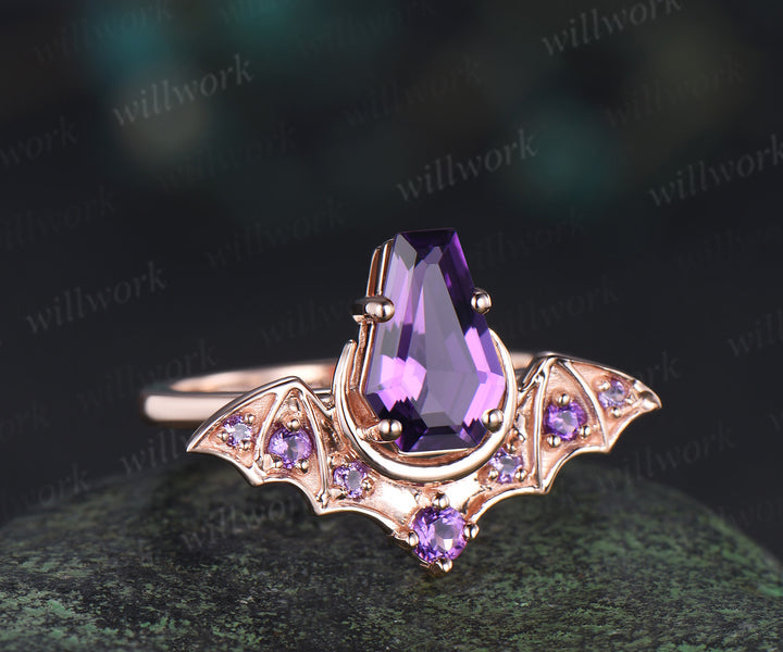 Kite coffin amethyst ring vintage wing bat moon unique engagement ring 14k rose gold wedding ring women