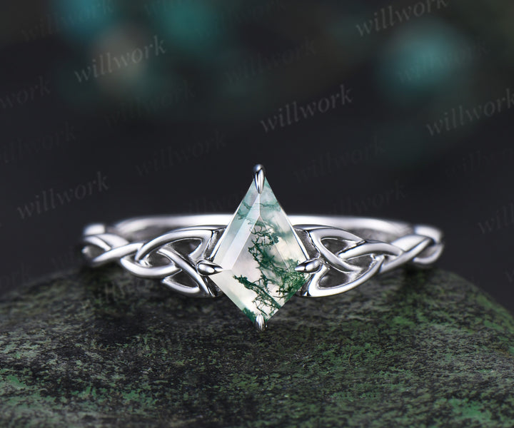 kite cut natural moss agate Celtic knot Solitaire engagement ring white gold Norse Viking Jewelry women anniversary gifts