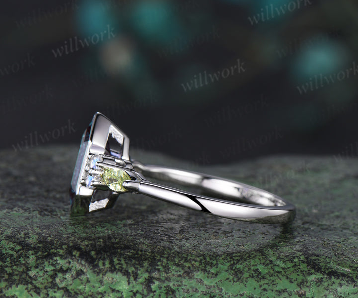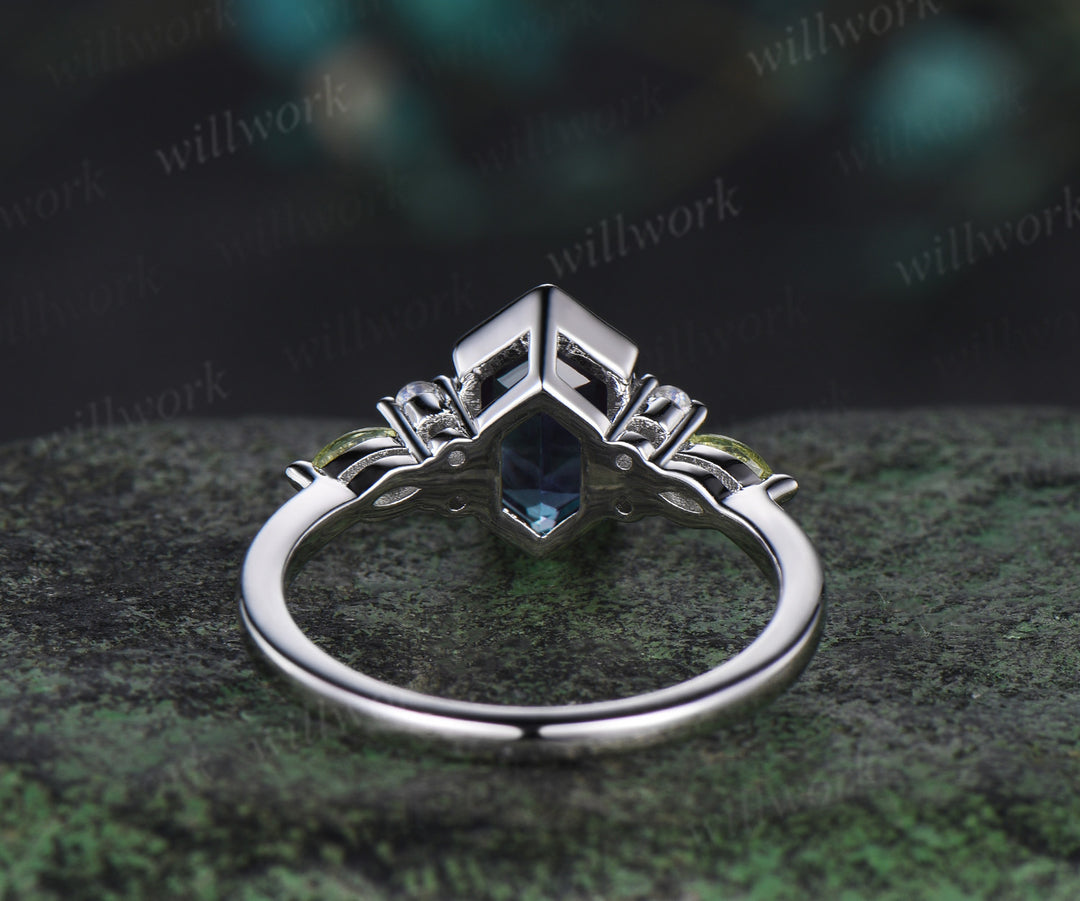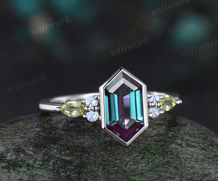 Long hexagon cut alexandrite bezel engagement ring 14k white gold moonstone peridot promise anniversary ring women