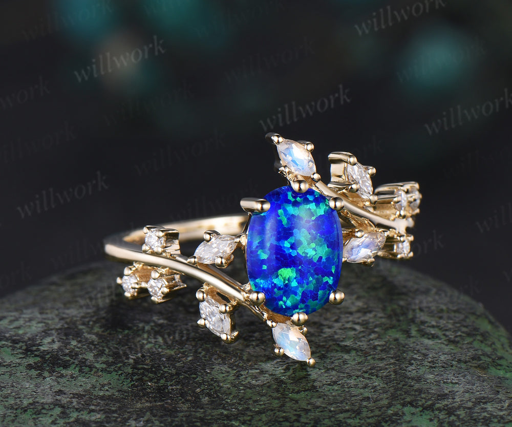 Oval blue opal engagement ring 14k yellow gold twisted cluster diamond moonstone wedding ring women jewelry