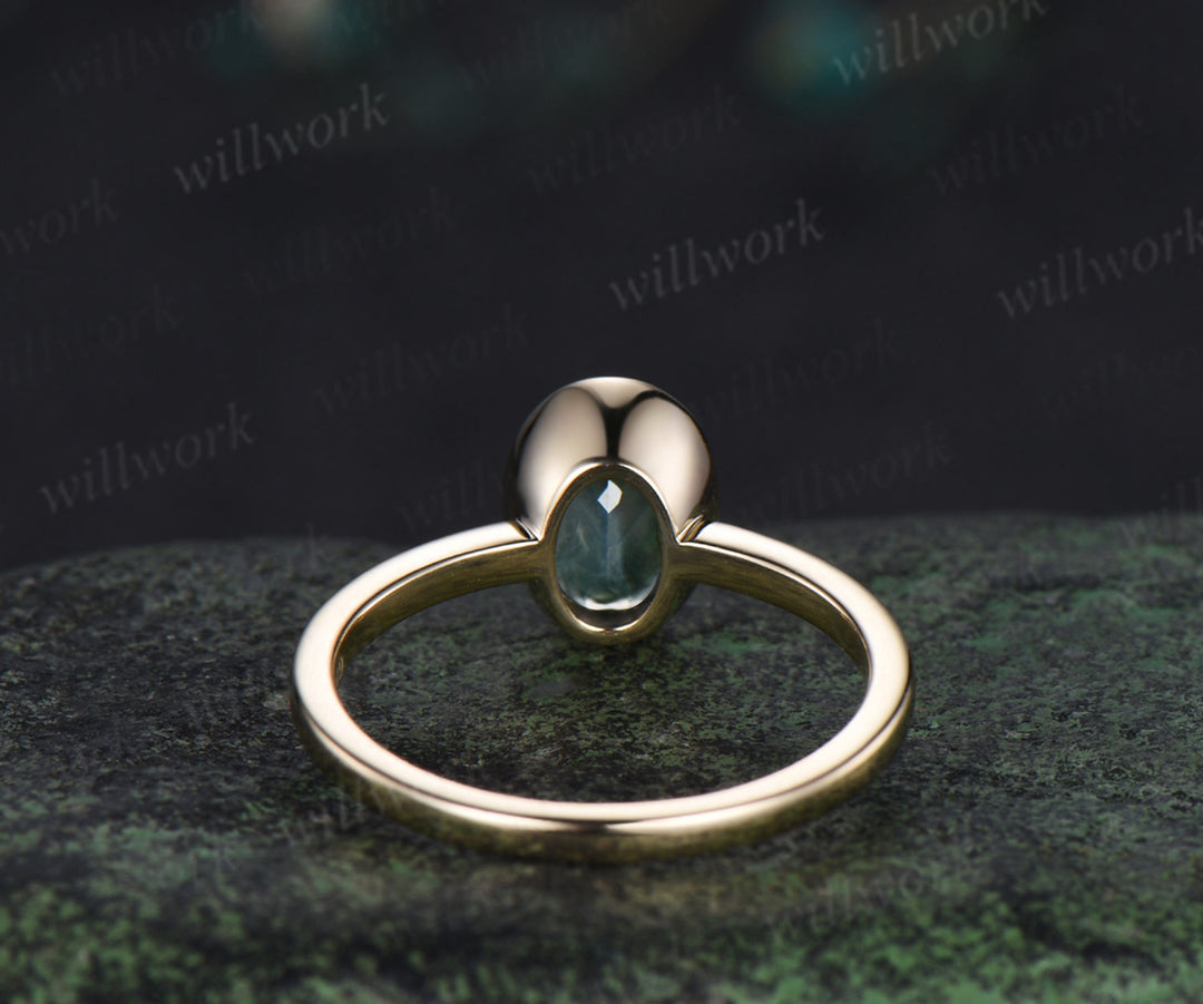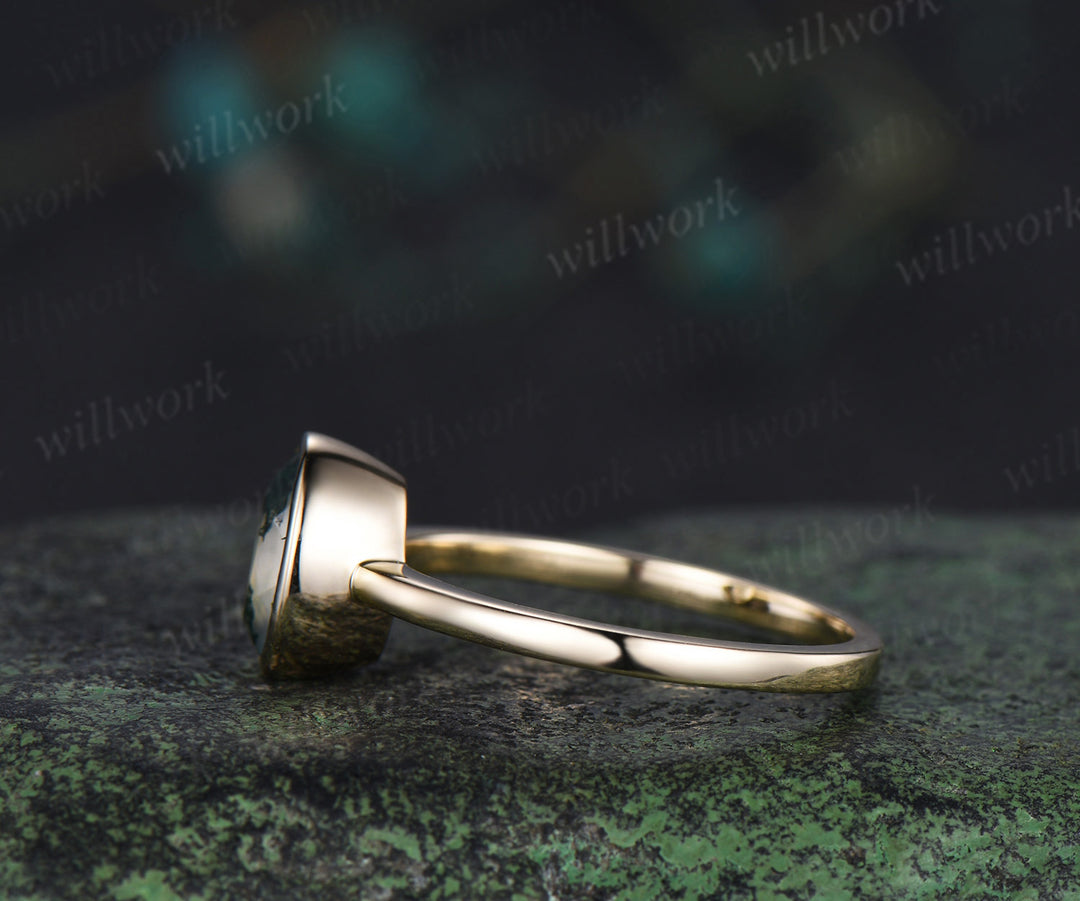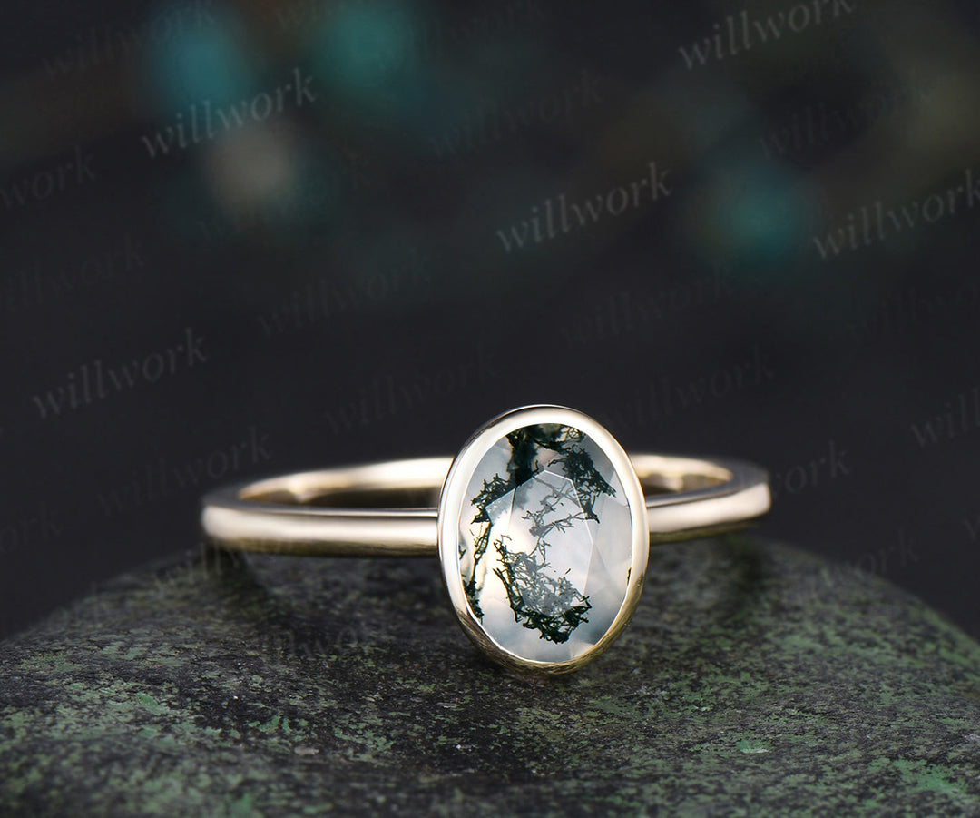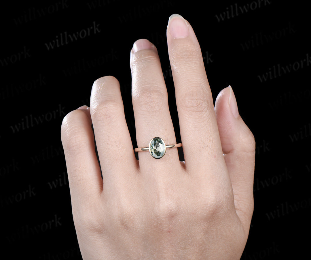 ***This oval cut natural moss agate engagement ring radiates earthy elegance. Set in a sleek bezel, the unique green inclusions bloom like a miniature forest. A one-of-a-kind solitaire ring inspired by nature?aperfect for women who love soulful, organic beauty.***- Metal: Solid gold(10K/14K/18K white/yellow/rose gold),925 sterling silver,platinum available