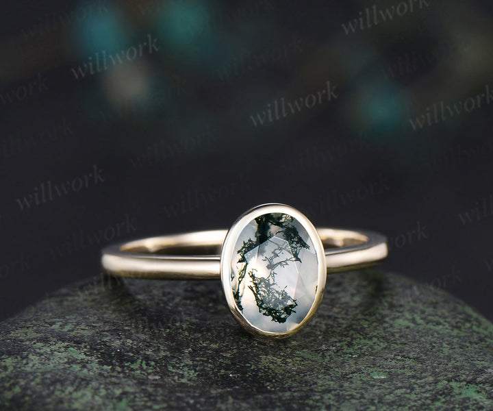 Oval cut natural moss agate engagement ring unique solitaire moss agate bezel ring solid 10k/14k/18k yellow gold ring for women