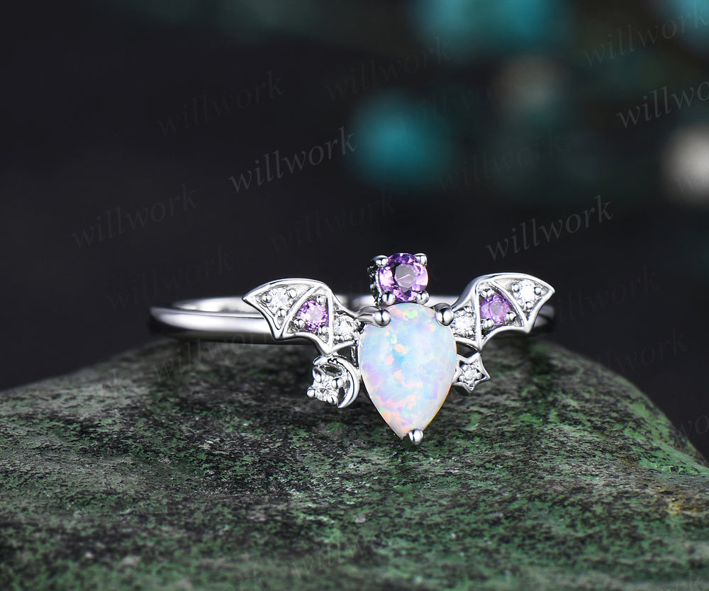 Pear opal ring vintage amethyst ring 14k white gold moon star bat unique engagement ring women wing diamond anniversary ring gift