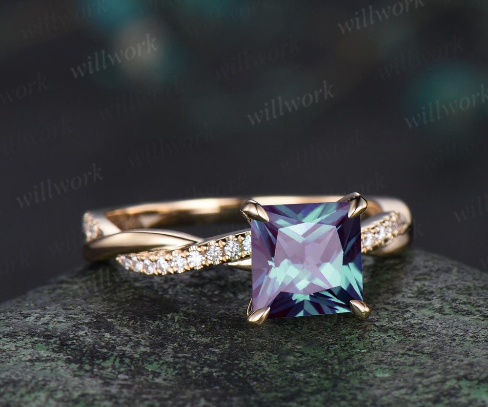 Princess cut alexandrite engagement ring 14k yellow gold 3/4 eternity twisted diamond ring vintage infinity promise ring women jewelry