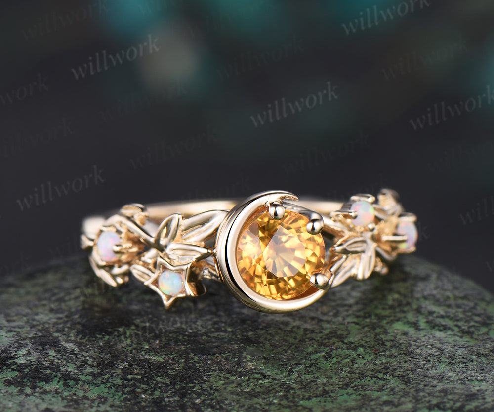 Round cut natural yellow sapphire Engagement Ring moon leaf star opal ring 14k gold vintage Nature Inspired unique wedding ring women