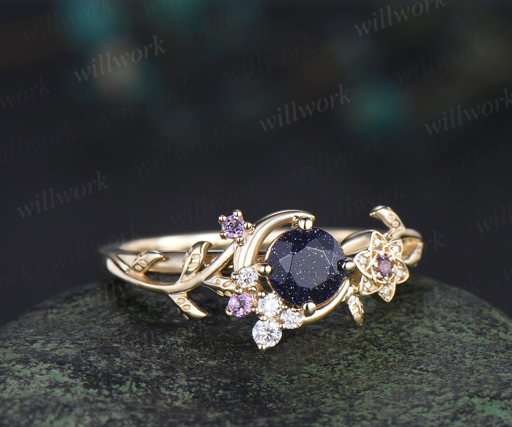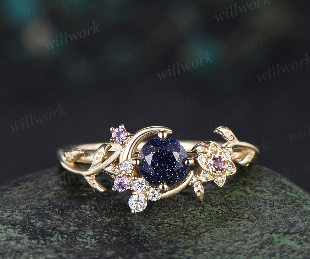 Round Galaxy Blue Sandstone ring cluster moon floral leaf Engagement Ring yellow gold amethyst wedding ring women