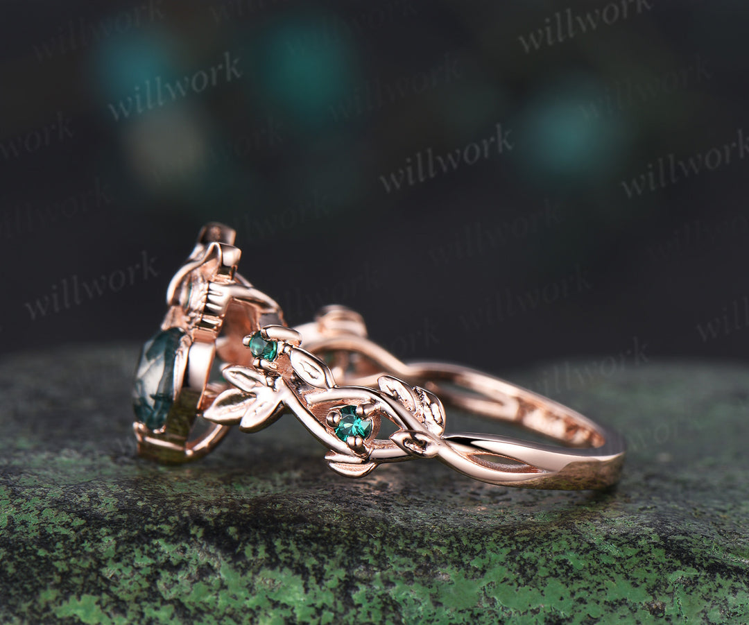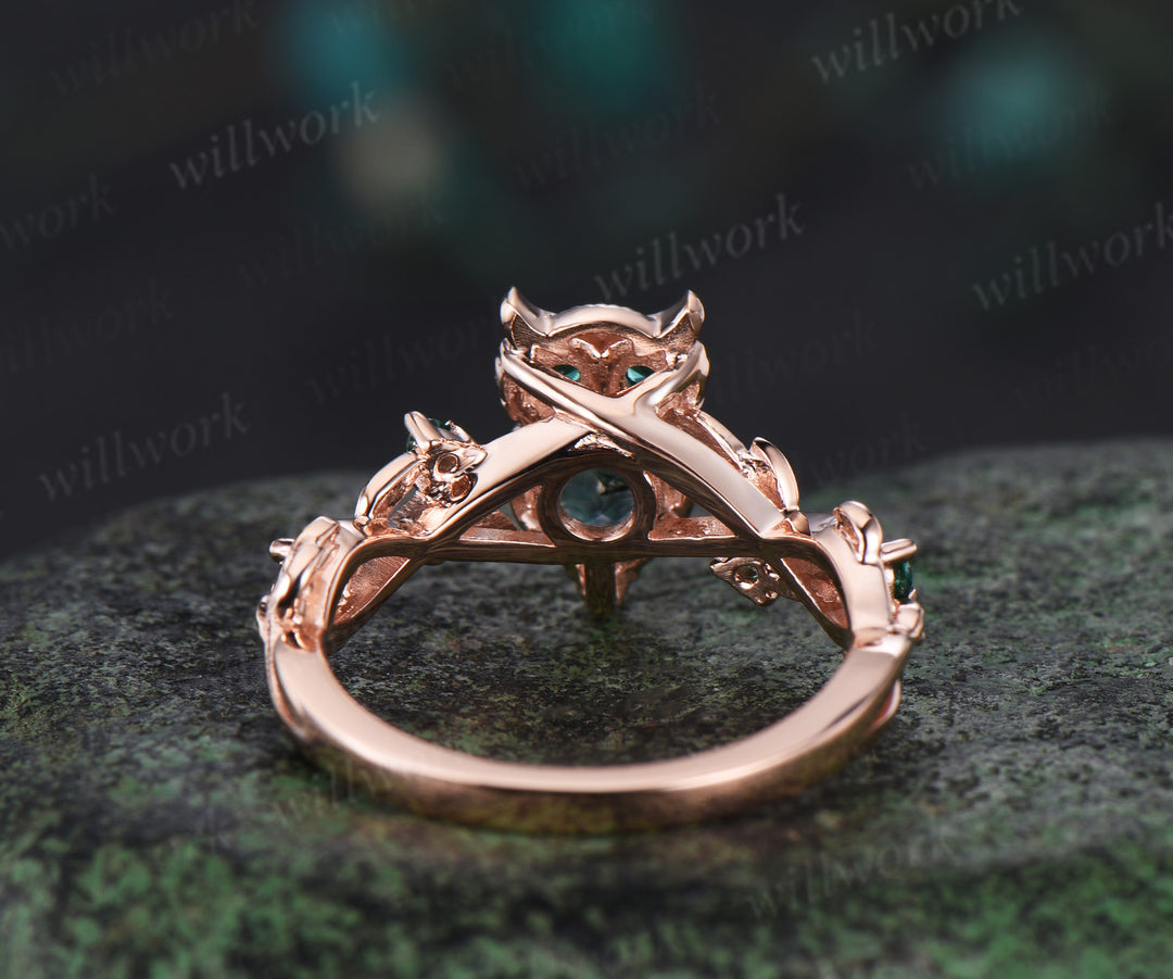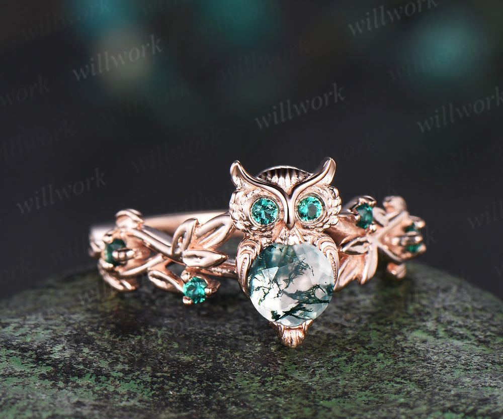 Round moss agate Owl Engagement Ring 14k rose gold emerald Branch Leaf Wedding Ring Nature Inspired Ring Birthday Gift for Owl Lover