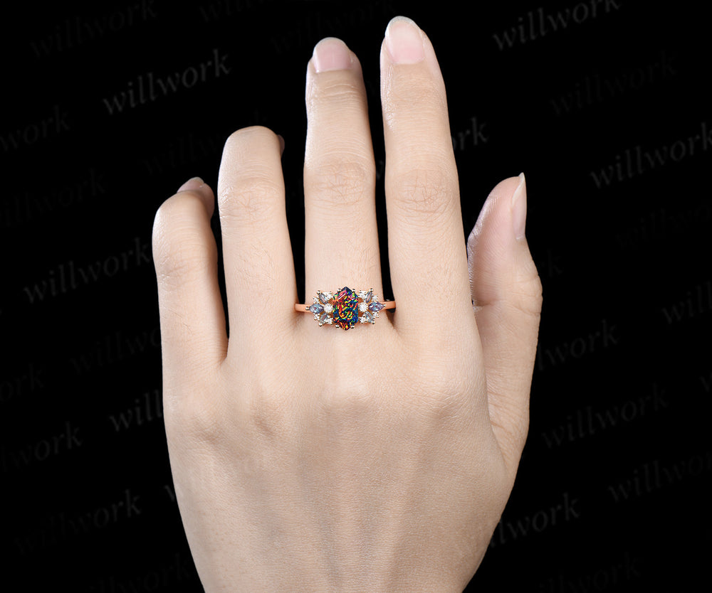 Unique hexagon cut black fire opal engagement ring milgrain moissanite marquise alexandrite cluster ring wedding bridal gifts