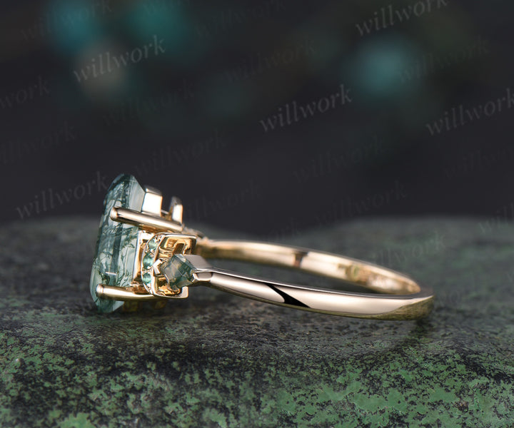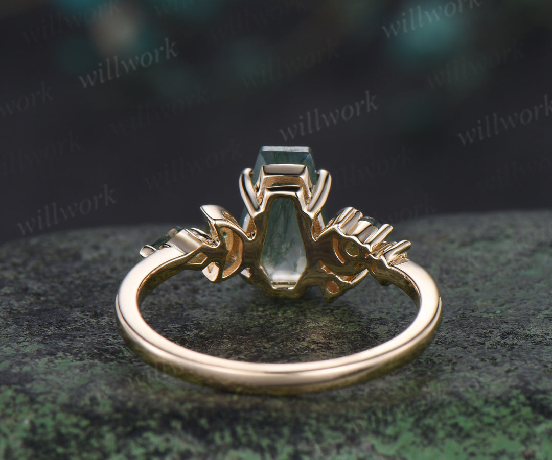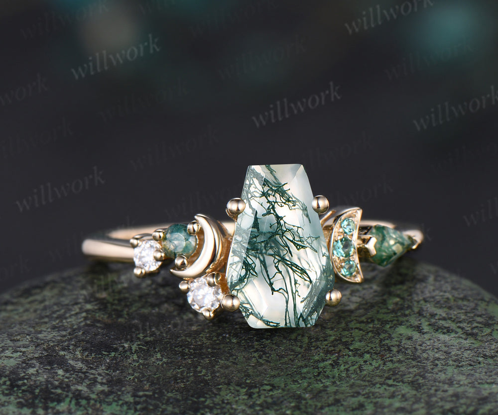Unique moon ring kite Coffin natural moss agate engagement ring yellow gold cluster emerald wedding ring perfect moon anniversary gift