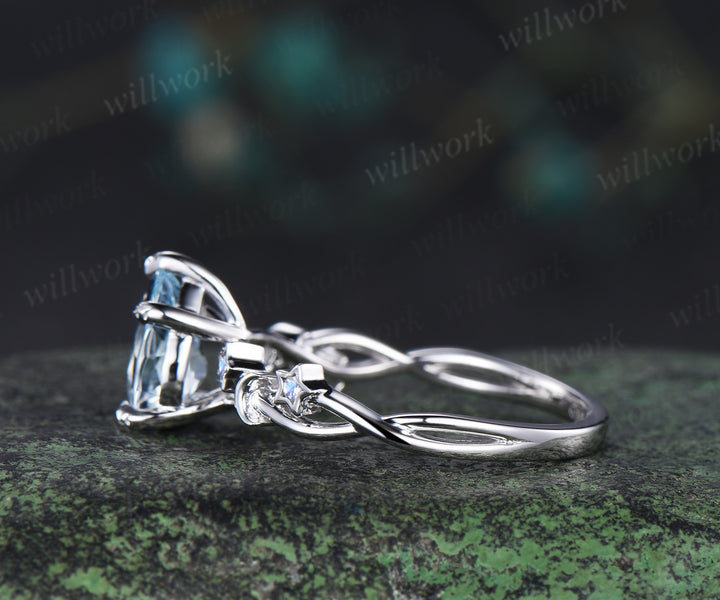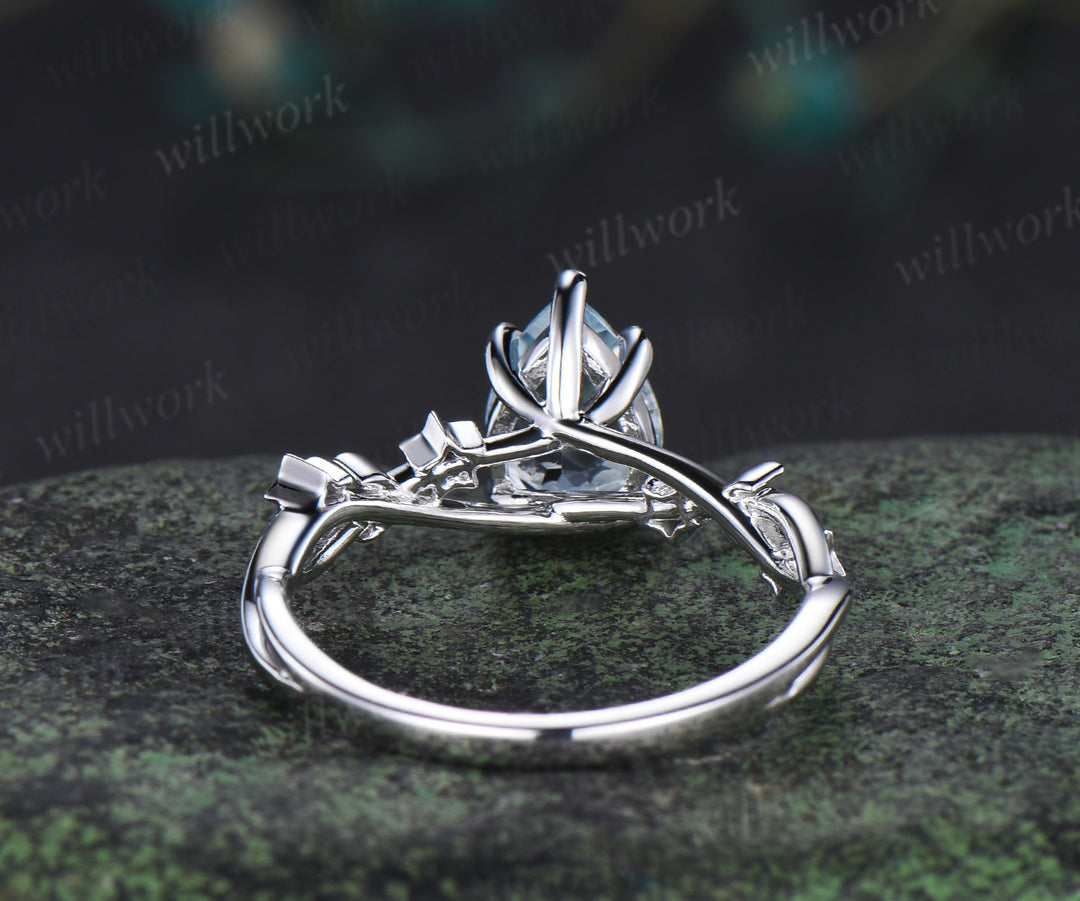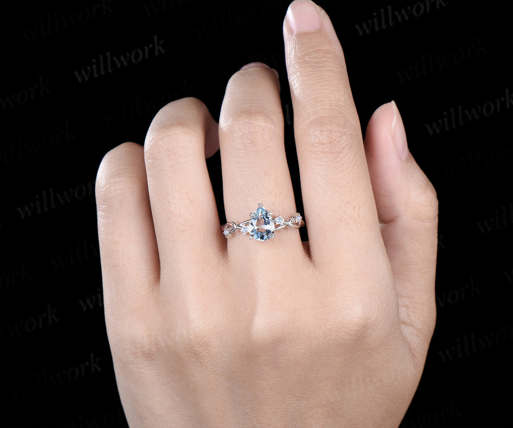 Unique pear aquamarine engagement ring moon & star infinity moonstone ring with leaf prongs celestial white gold bridal jewelry