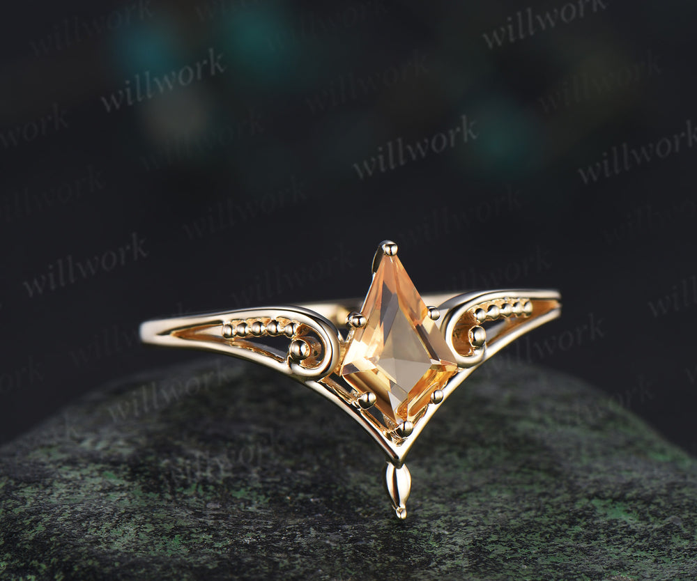 Vintage kite cut citrin engagement ring solitaire split shank milgrain wedding ring November birthstone gifts
