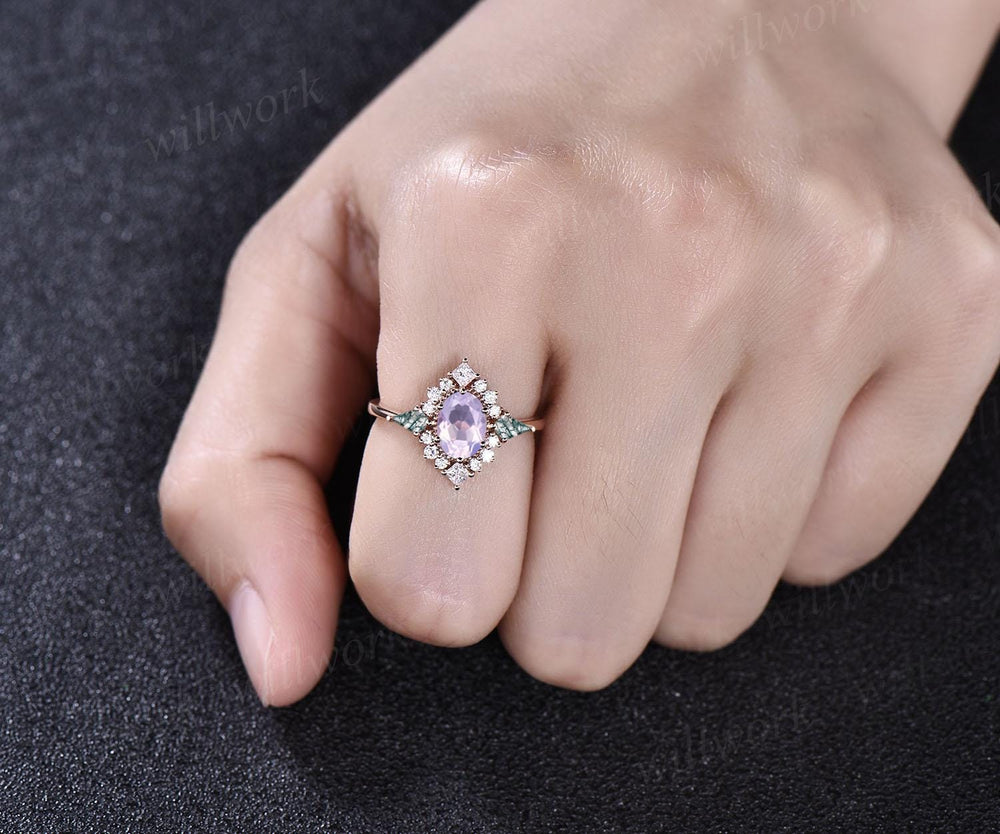 Vintage oval Lavender Amethyst engagement ring 14k rose gold halo princess diamond ring kite moss agate ring women retro wedding ring gift