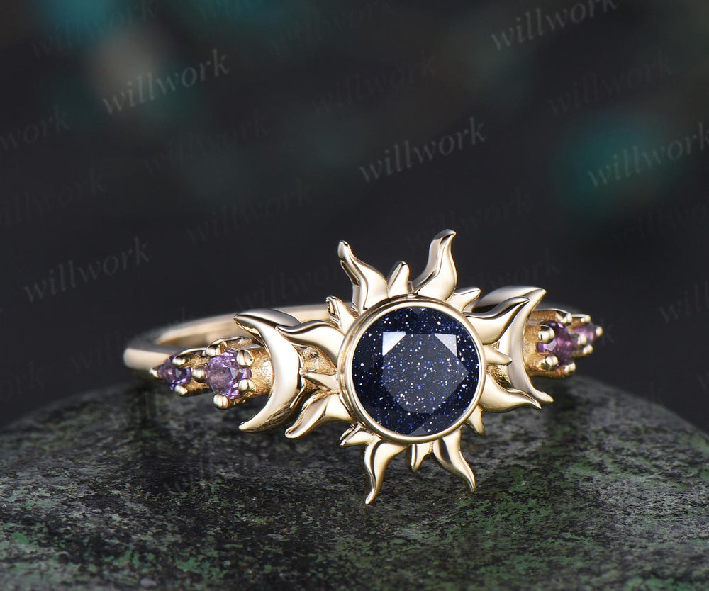 Vintage round cut blue sandstone sun bezel engagement ring solid 14k yellow gold five stone amethyst moon unique bridal ring women