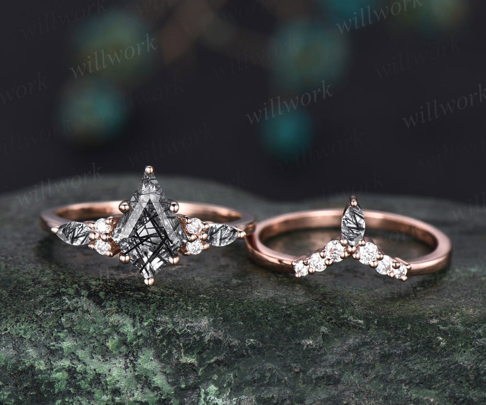 Vintage kite cut black rutilated quartz engagement ring set marquise cut ring 14k rose gold unique diamond promise wedding ring set women