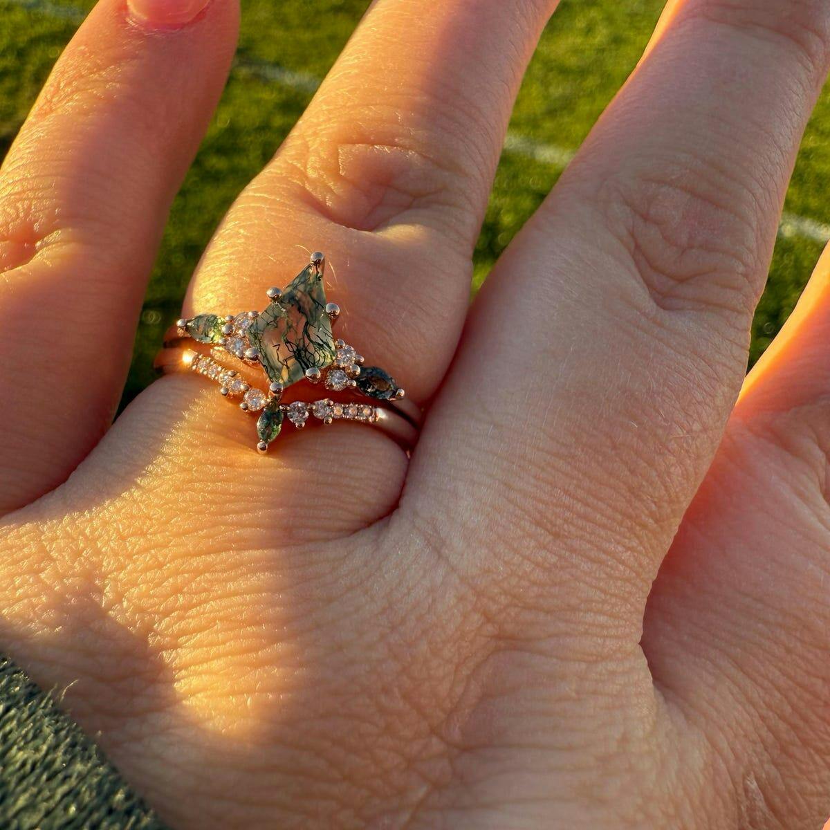 ***For brides looking for something very non-traditional, this ring is the perfect choice to go for. Not only do the bands of this ring give a timeless aesthetic, but the green moss agate stone also makes the entire ring saturated in color. The kite shaped engagement ring is set with a natural green moss agate center stone and marquise green moss agate and round shape moissnaites***- Metal: Solid gold(10K/14K/18K white/yellow/rose gold),925 sterling silver,platinum available