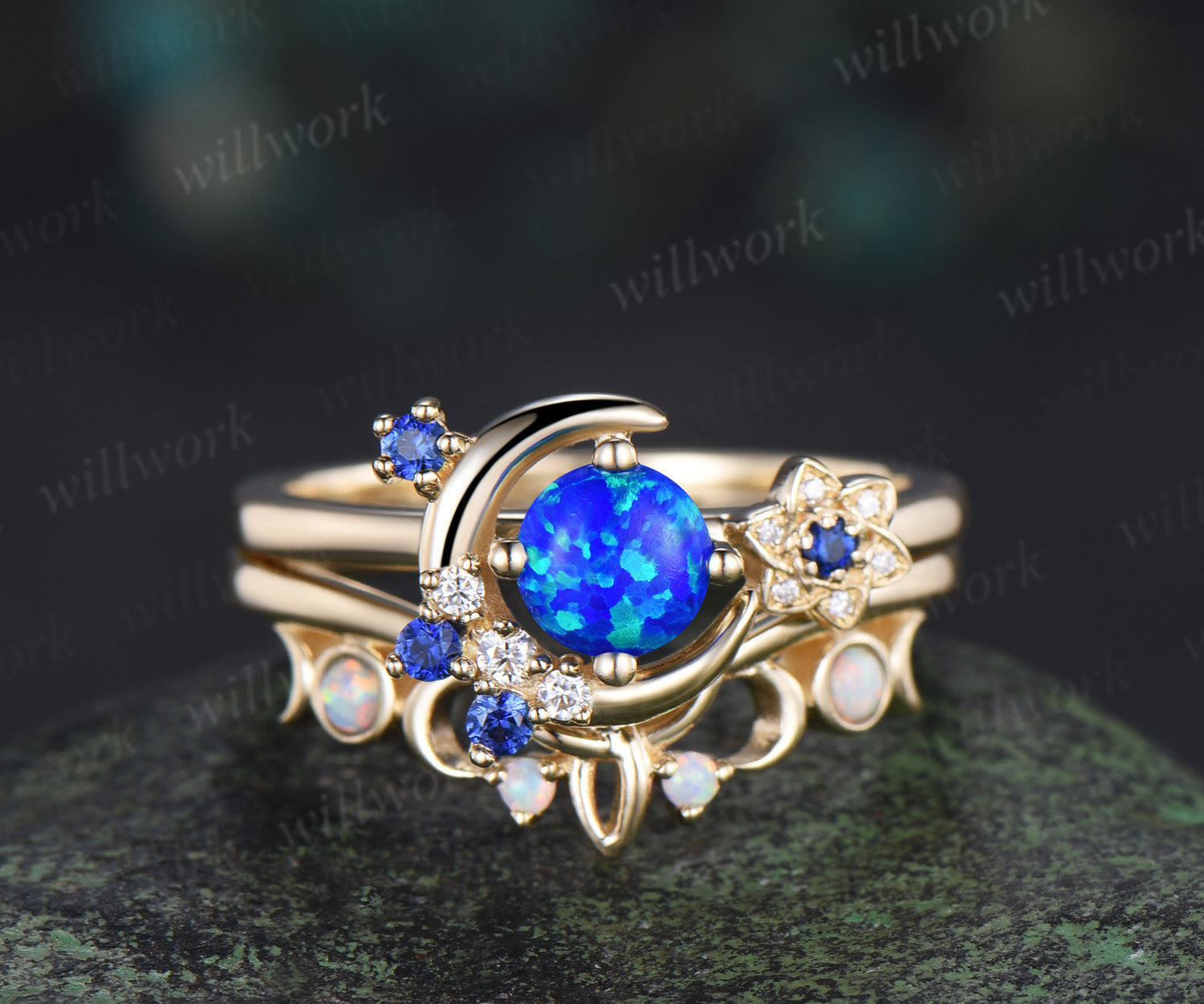 Round blue opal ring gold cluster moon Celtic knot engagement ring set sapphire opal wedding bridal set women Round blue opal ring gold cluster moon Celtic knot engagement ring set sapphire opal wedding bridal set women $280.00