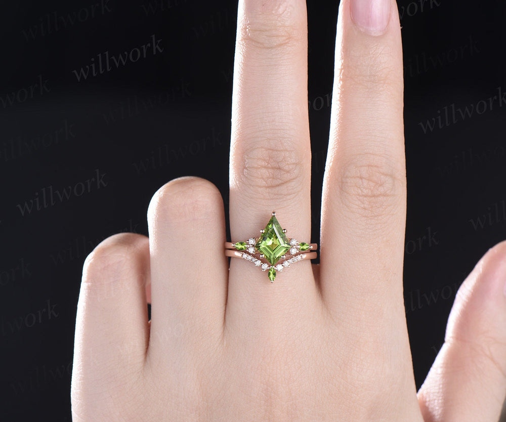 8x11mm kite cut peridot ring solid 14k rose gold green peridot engagement ring se  women art deco vintage diamond wedding bridal ring set 8x11mm kite cut peridot ring solid 14k rose gold green peridot engagement ring se women art deco vintage diamond wedding bridal ring set $1,024.00