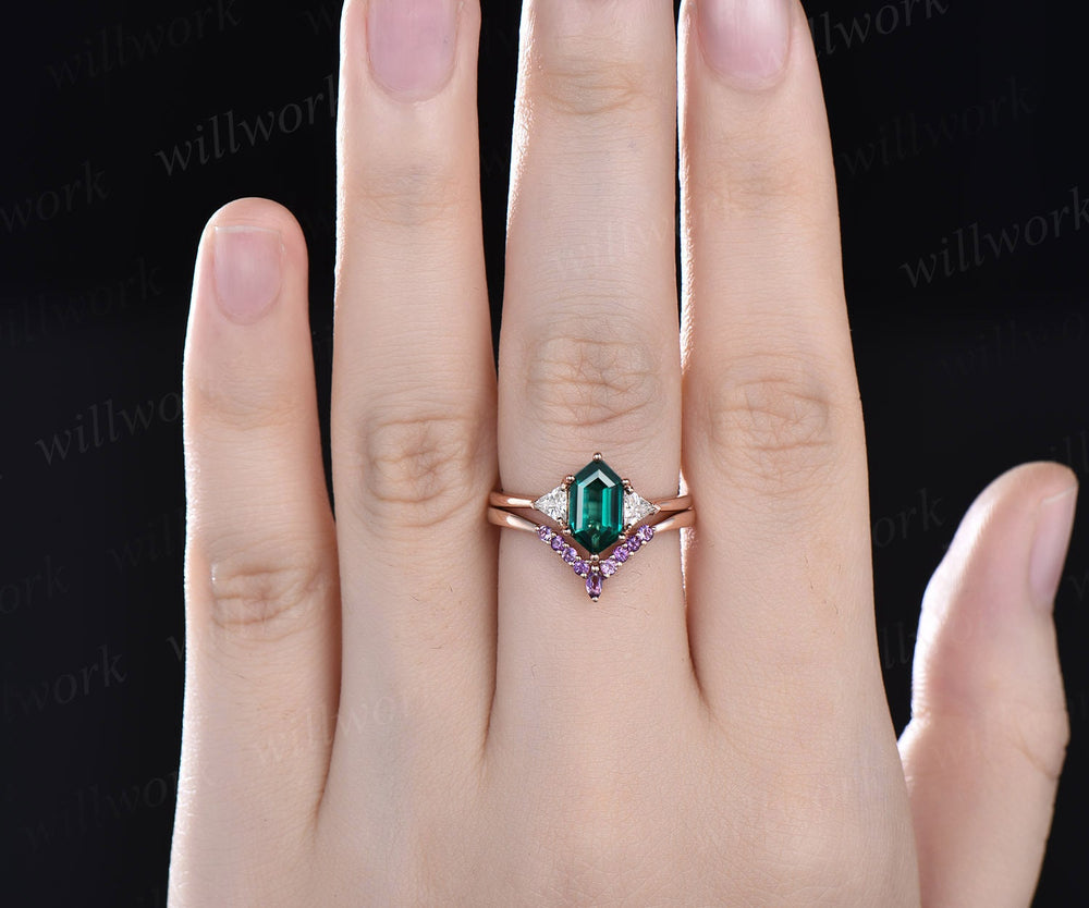 Amethyst emerald ring set women vintage three stone engagement ring set solid 14k rose gold 6 prong moissanite promise ring set her gifts