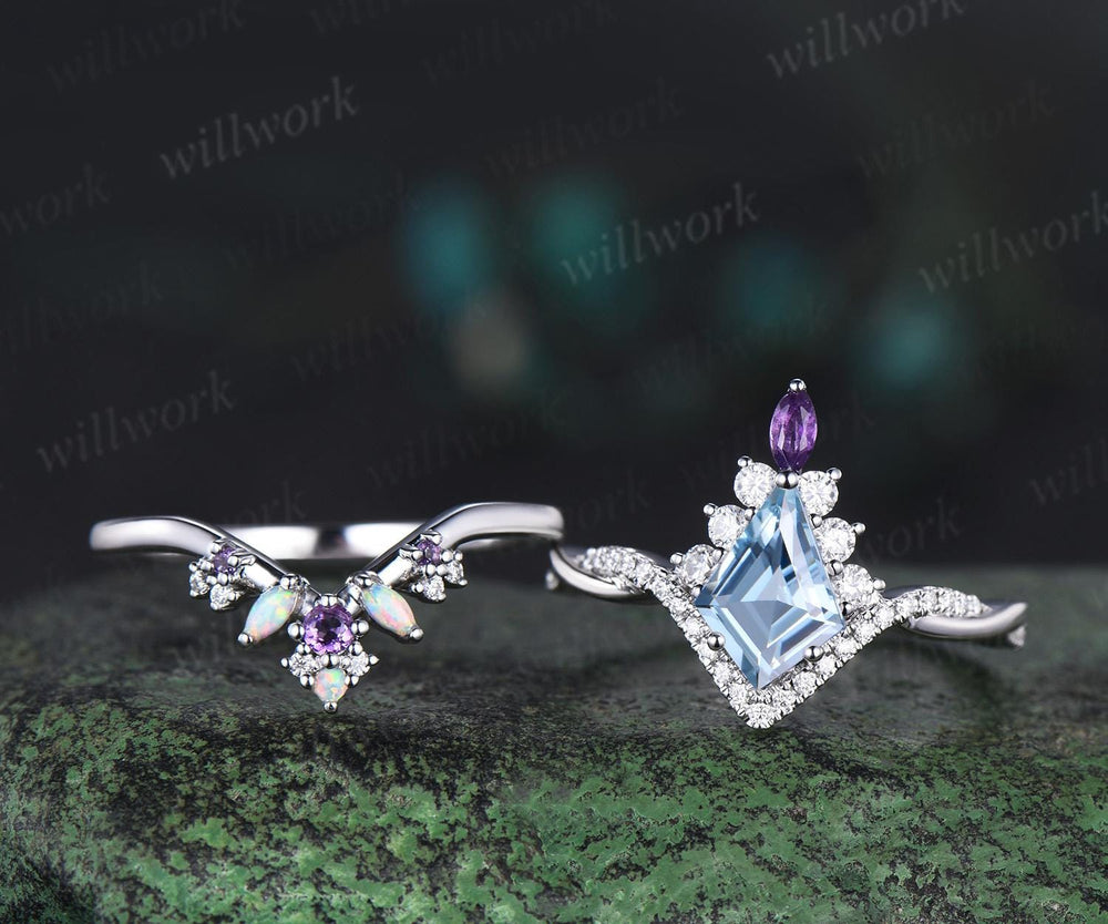 Kite cut aquamarine engagement ring set twisted halo diamond ring vintage 14k white gold amethyst promise wedding ring set women gift