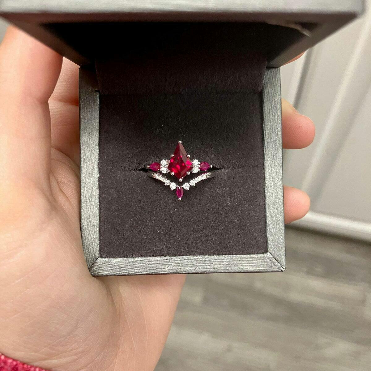 Kite cut red ruby engagement ring art deco rose gold moissanite ring marquise cut natural ruby ring vintage wedding bridal ring set women