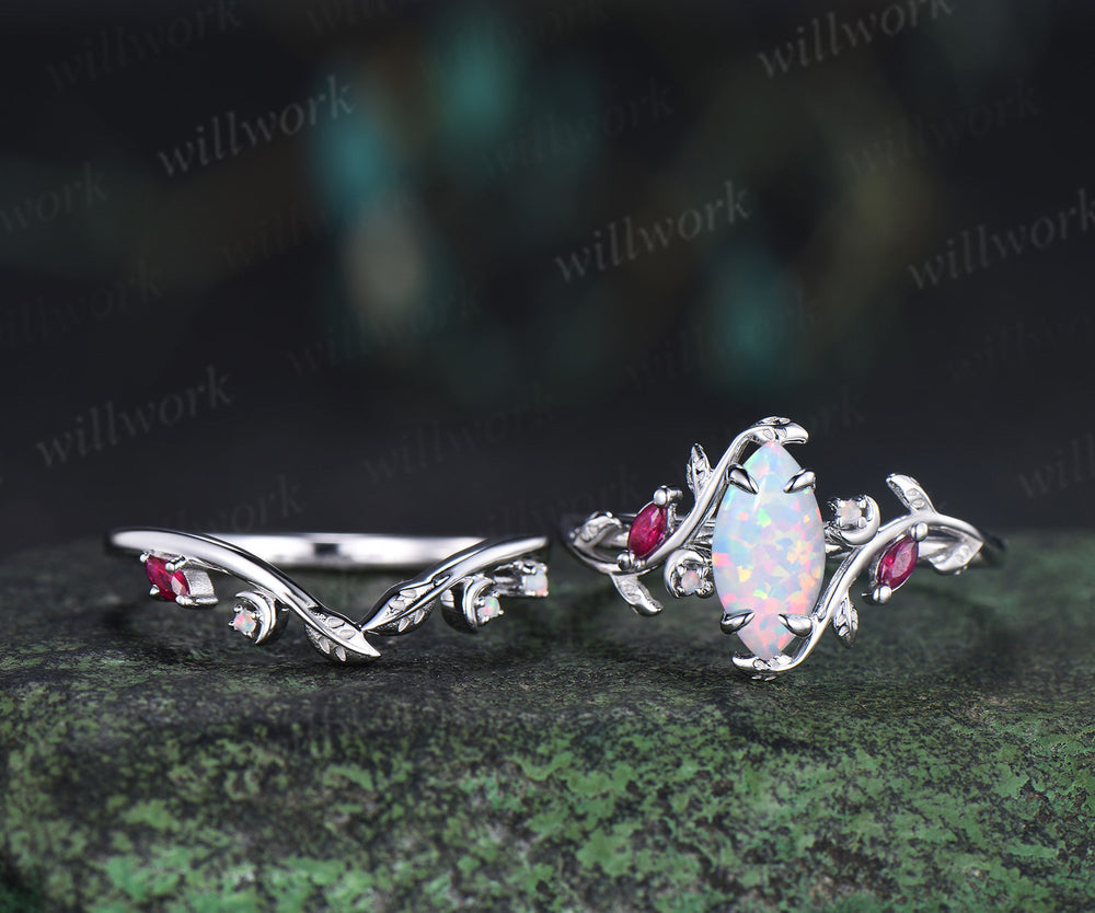 Marquise opal ring white gold leaf moon nature inspired engagement ring set vintage ruby ring women