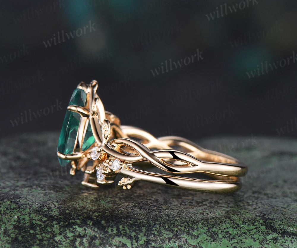 Pear cut green emerald ring vintage infinity split shank engagement ring set art deco leaf diamond ring women retro unique bridal set gift