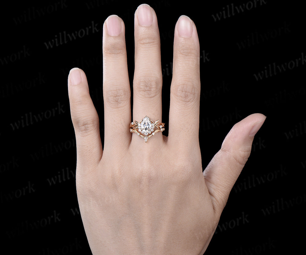 Pear cut IGI Lab grown diamond engagement ring vintage infinity diamond leaf ring set stacking unique wedding promise ring women gift