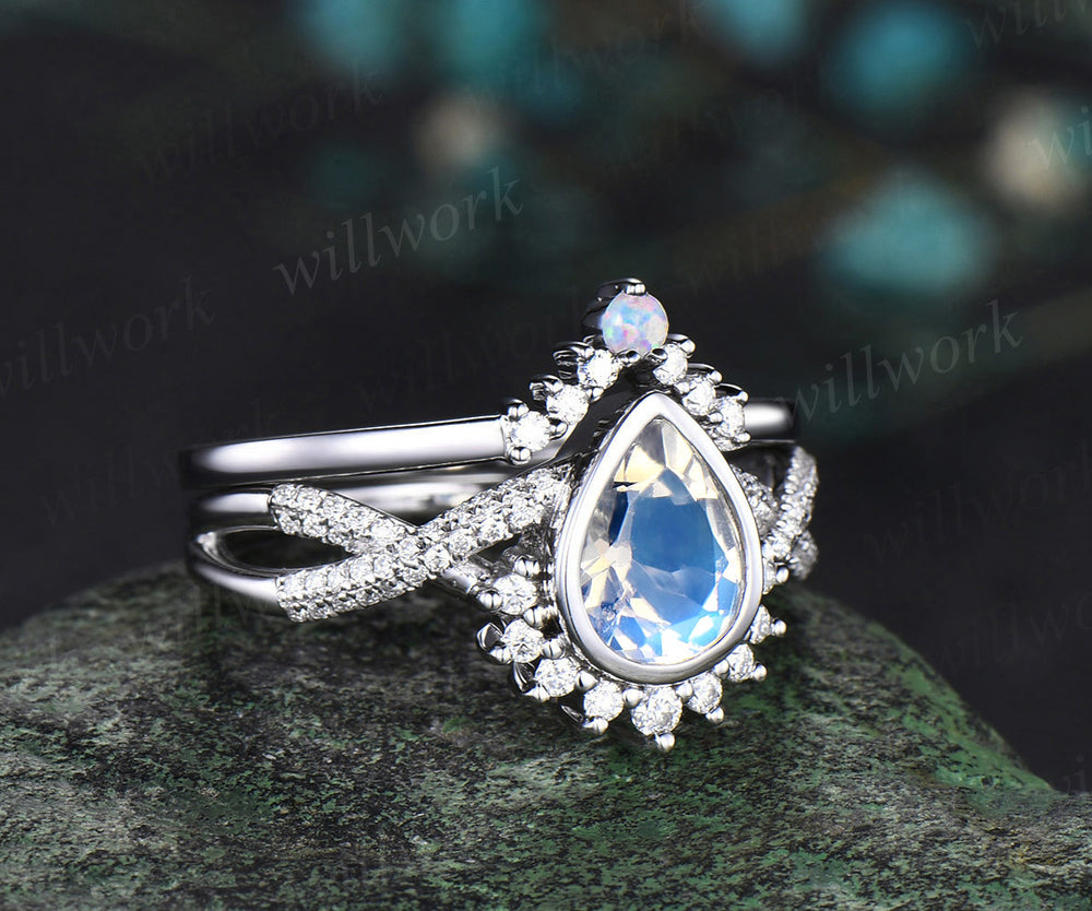 Pear moonstone bezel infinity ring set moonstone diamond engagement ring curved V opal wedding band vintage bridal set