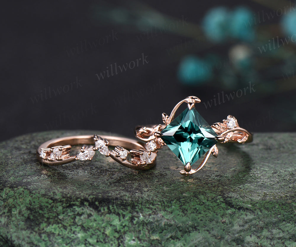 Princess cut green sapphire ring vintage rose gold diamond twig leaf unique engagement ring set three stone anniversary ring women gift