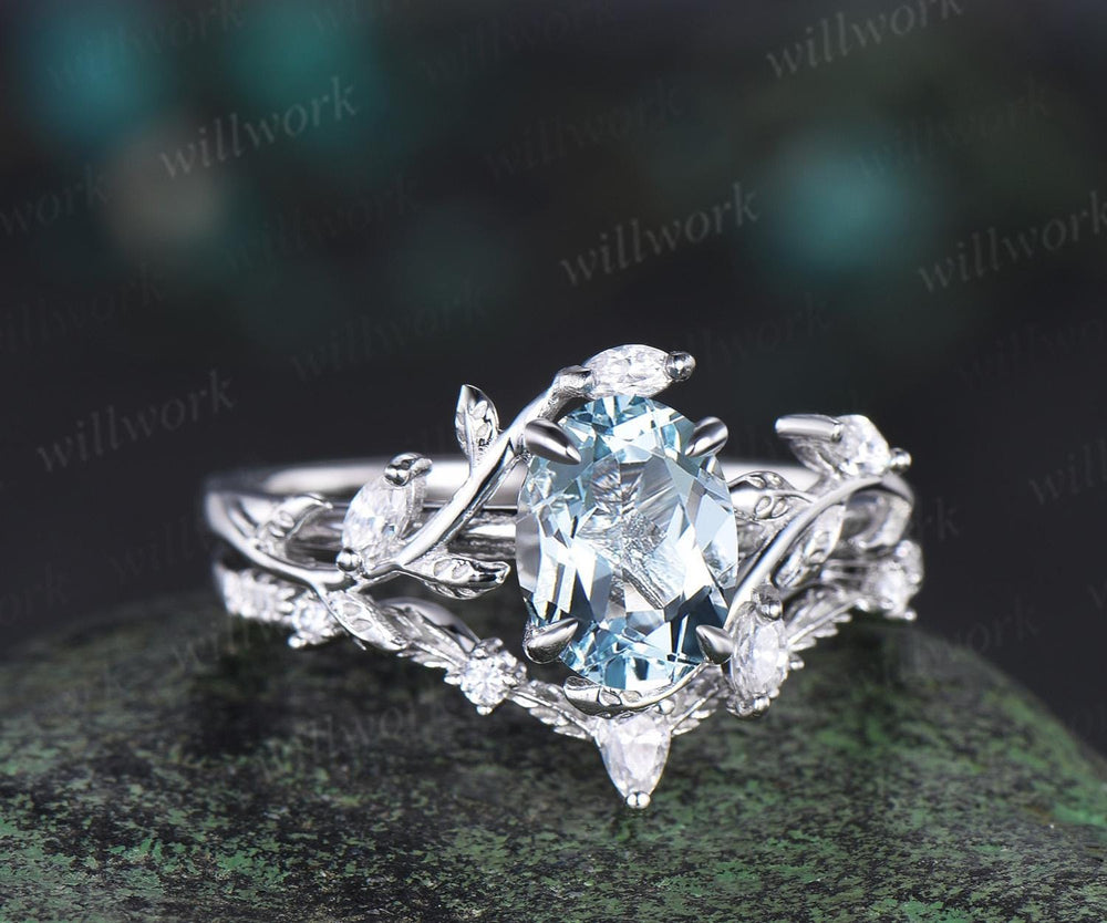 Vintage oval cut aquamarine engagement ring 14k white gold leaf nature inspired ring women unique cluster diamond bridal promise ring set
