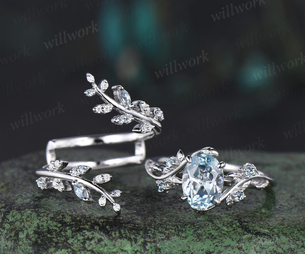 Vintage oval natural aquamarine engagement ring branch leaf white gold wedding band enhancer twisted bridal ring set women jewelry