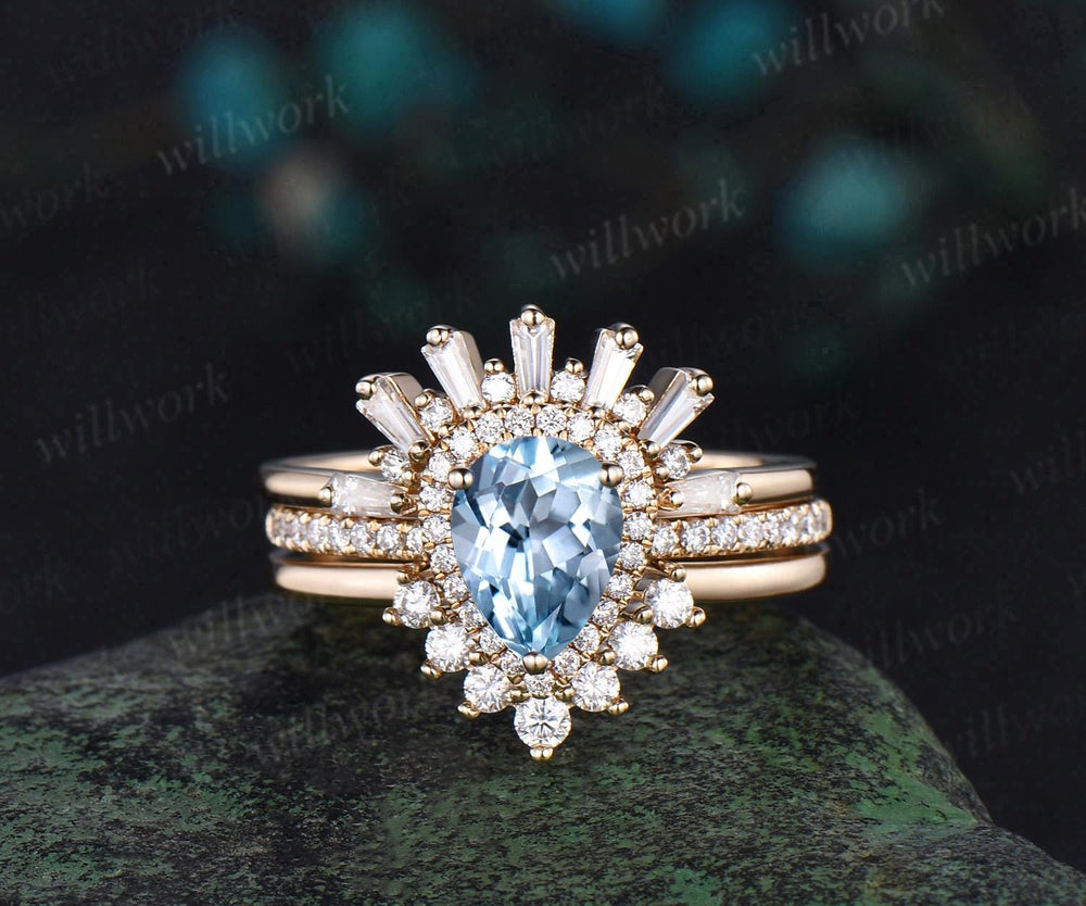 Vintage pear Aquamarine engagement ring set yellow gold crown halo baguette moissanite stacking bridal wedding ring set women jewelry