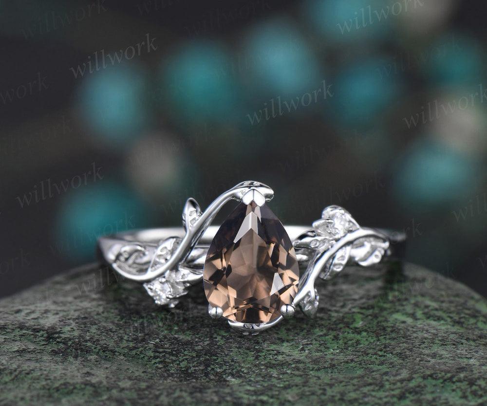 Vintage pear Smoky quartz engagement ring set women white gold brown quartz ring leaf twig diamond Crystal anniversary ring women gift