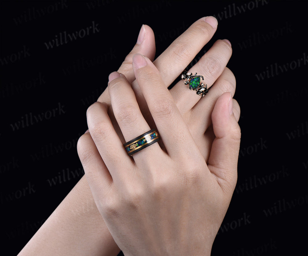 Vintage Pear Black Opal Leaf Vine Moon Ring Set & Tungsten Black Opals Gold Flakes Men Band Couple Ring Set Vintage Pear Black Opal Leaf Vine Moon Ring Set & Tungsten Black Opals Gold Flakes Men Band Couple Ring Set $526.00