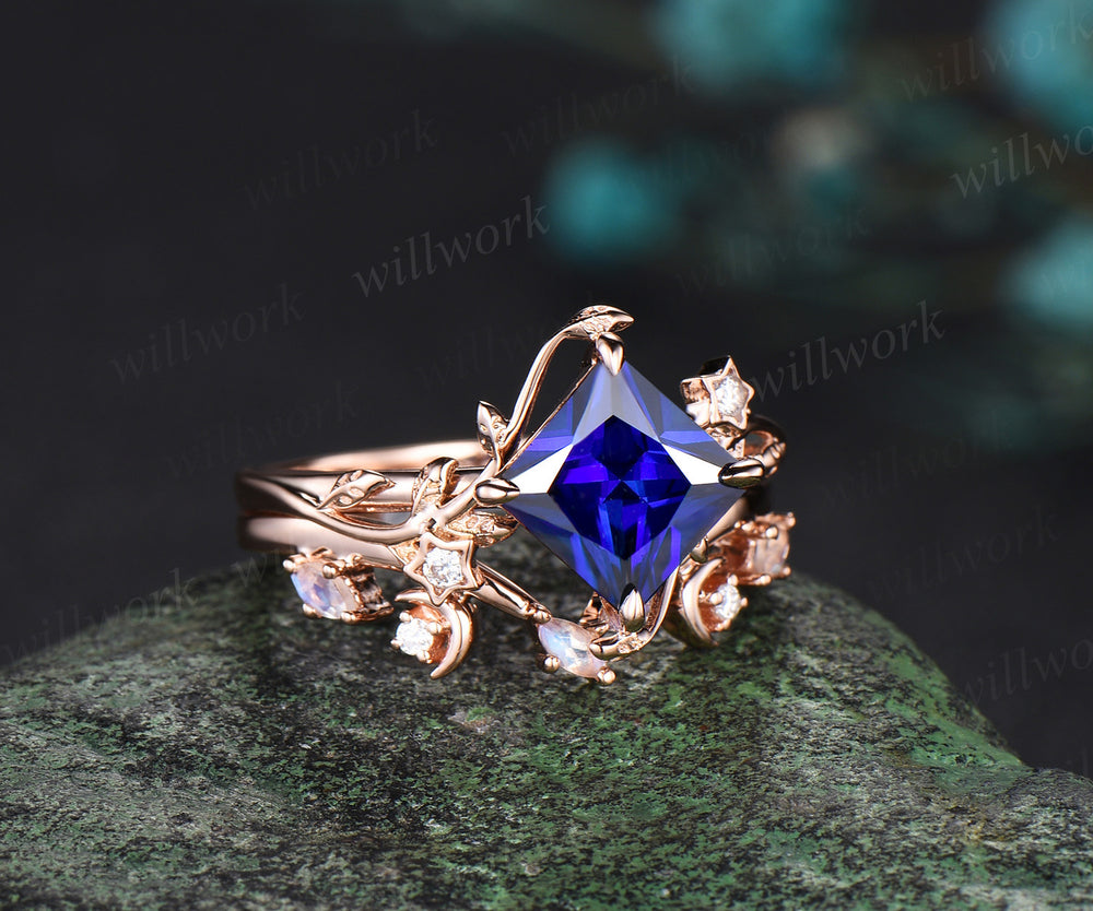 Vintage princess cut sapphire engagement ring set rose gold star leaf moon moonstone ring women unique bridal wedding ring set women