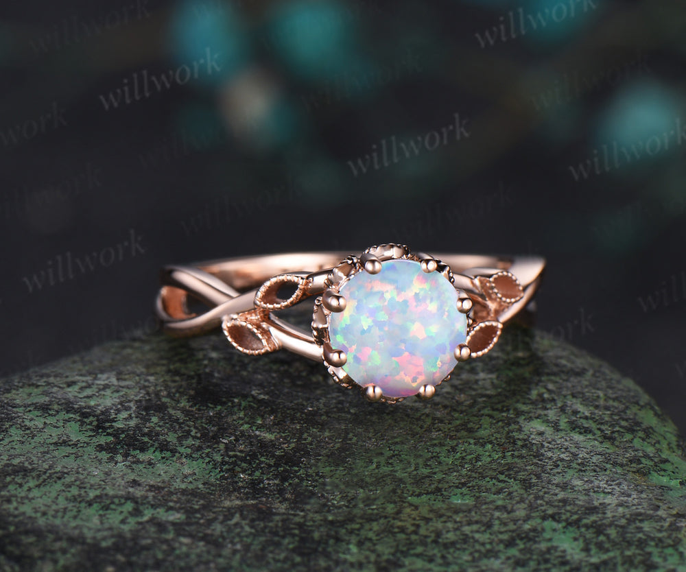 Vintage round white opal engagement ring solid 14k rose gold infinity marquise leaf under halo diamond wedding ring set women