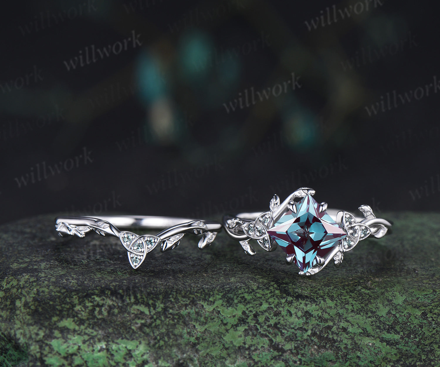 Princess cut alexandrite engagement ring set art deco color change stone celtic knot leaf twig ring unique bridal set