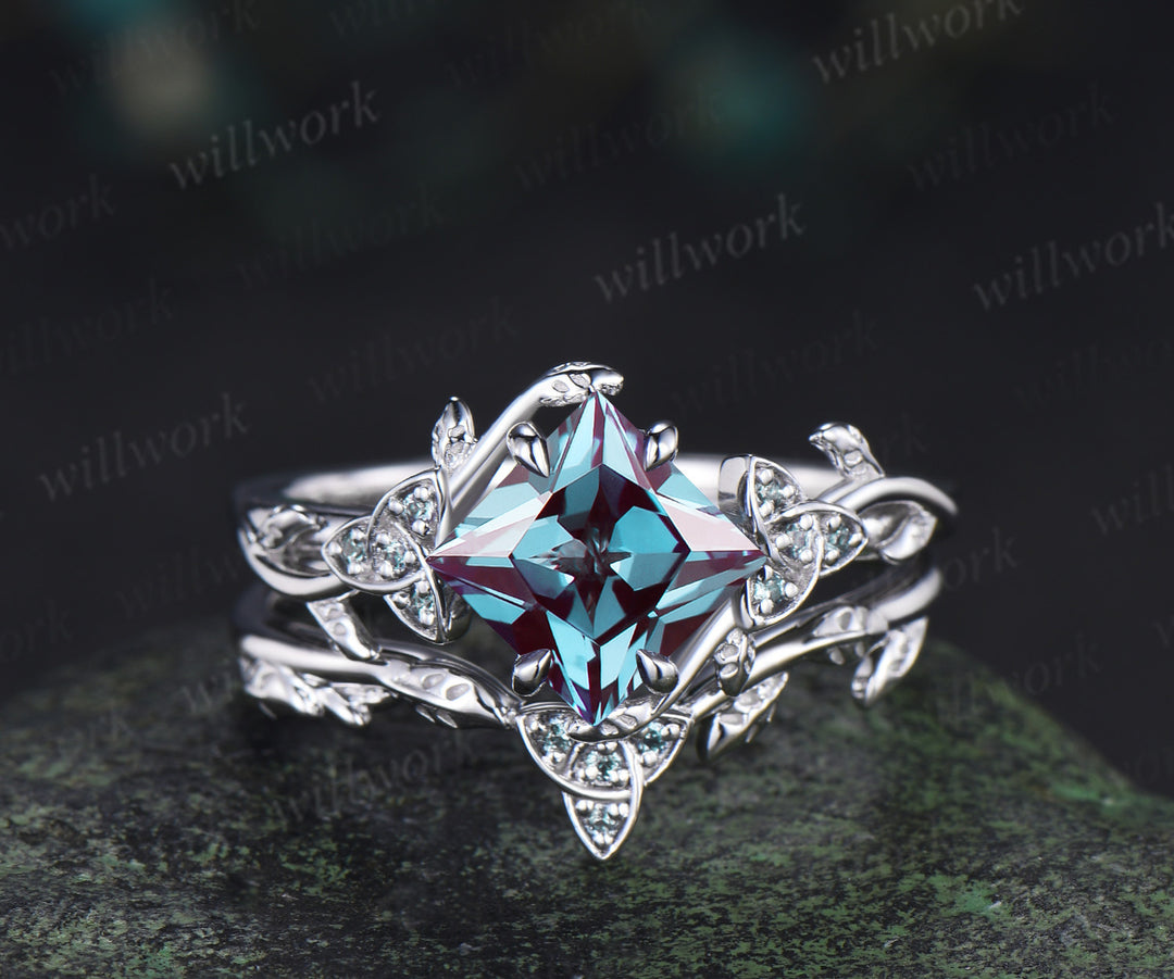 Princess cut alexandrite engagement ring set art deco color change stone celtic knot leaf twig ring unique bridal set