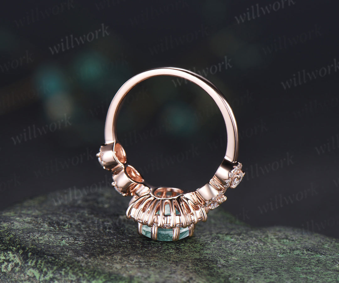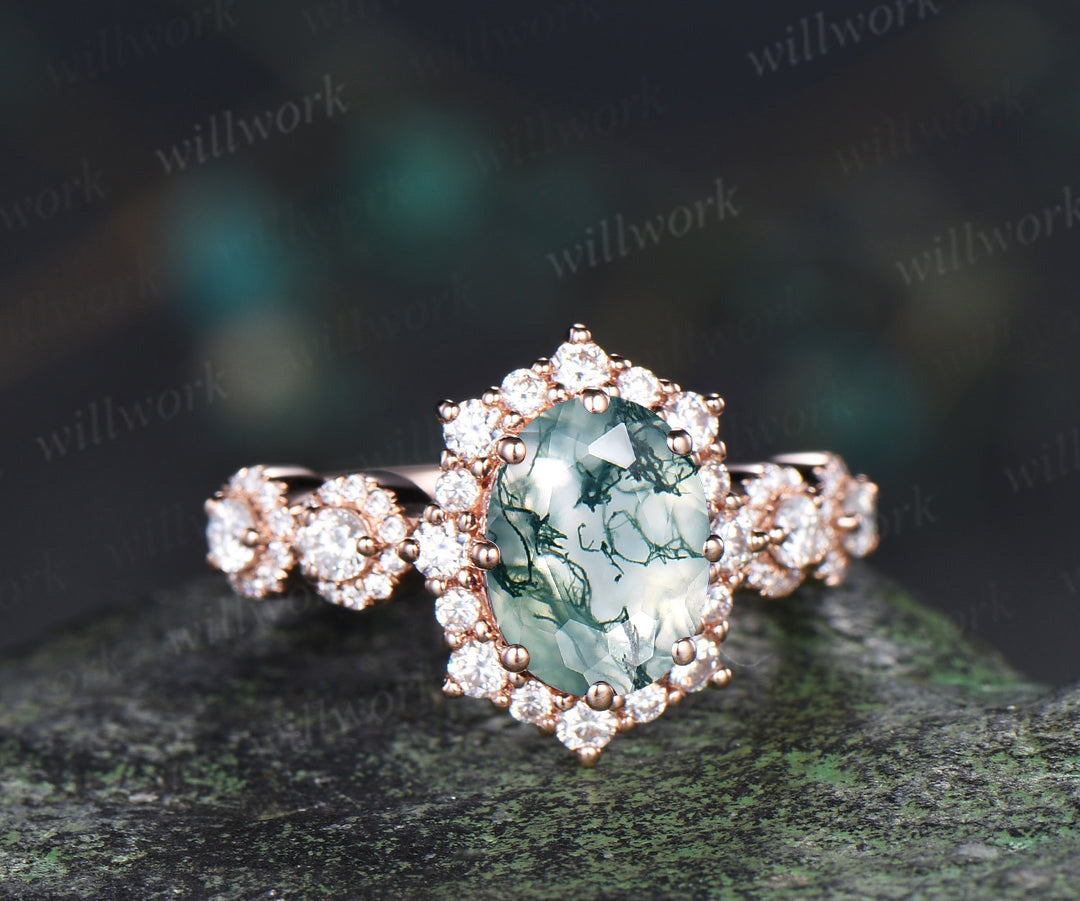 Vintage oval cue moss agate engagement ring art deco unique halo moissanite bridal ring