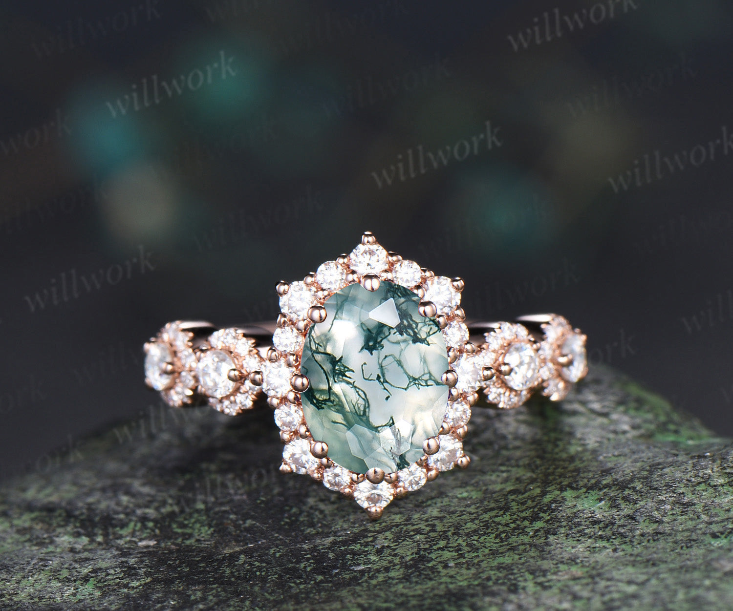 - Main Stone: 7x9mm oval cut natural moss agate