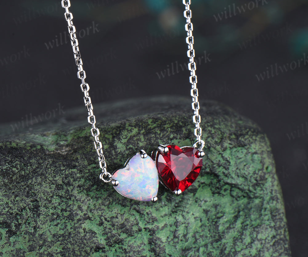 Delicate Heart Cut July Birthstone Ruby Necklace Minimalist October Birthstone Opal Two Stone Pendant 14k White Gold Double Heart Necklace